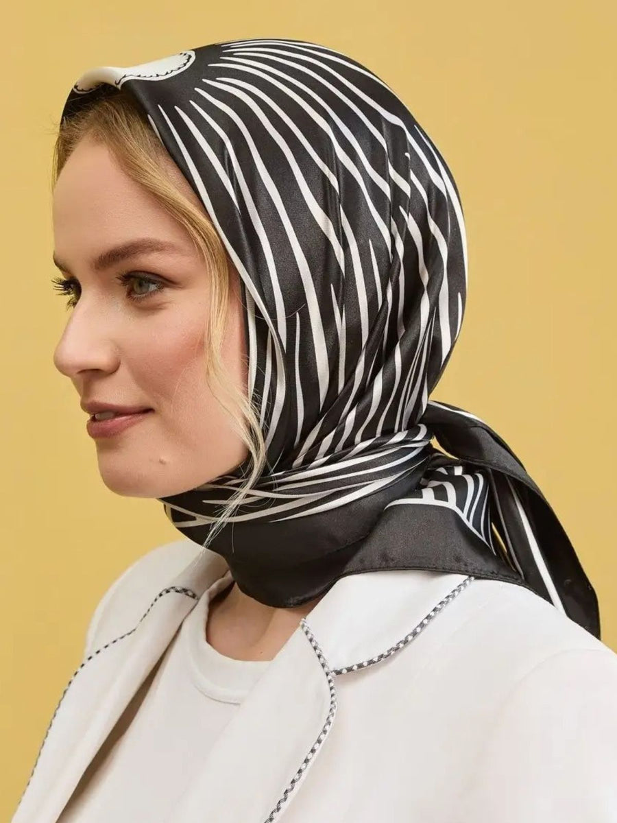 Foulard carré da donna effetto satinato nero bianco, foulard stampato grafico chic, accessorio per capelli o collo, foulard 90x90 cm in seta sintetica, foulard carré versatile, modello Davinah