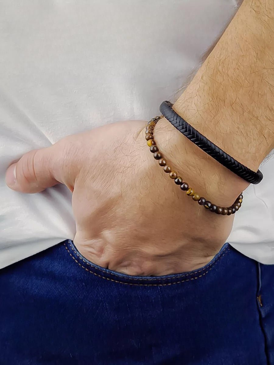 Bracciale in pelle intrecciata, pietre in occhio di tigre, chiusura magnetica, gioiello uomo, modello Deny