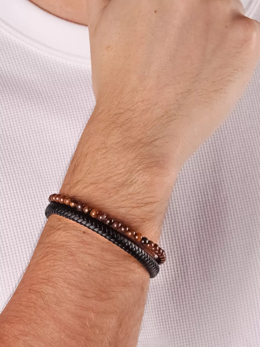 Il suo doppio giro combina una fascia in pelle intrecciata nera e una fila di perle di occhio di tigre, una pietra nota per le sue proprietà protettive ed energizzanti. Il tutto è arricchito da una chiusura magnetica in acciaio inox, che garantisce una chiusura sicura e di facile utilizzo.