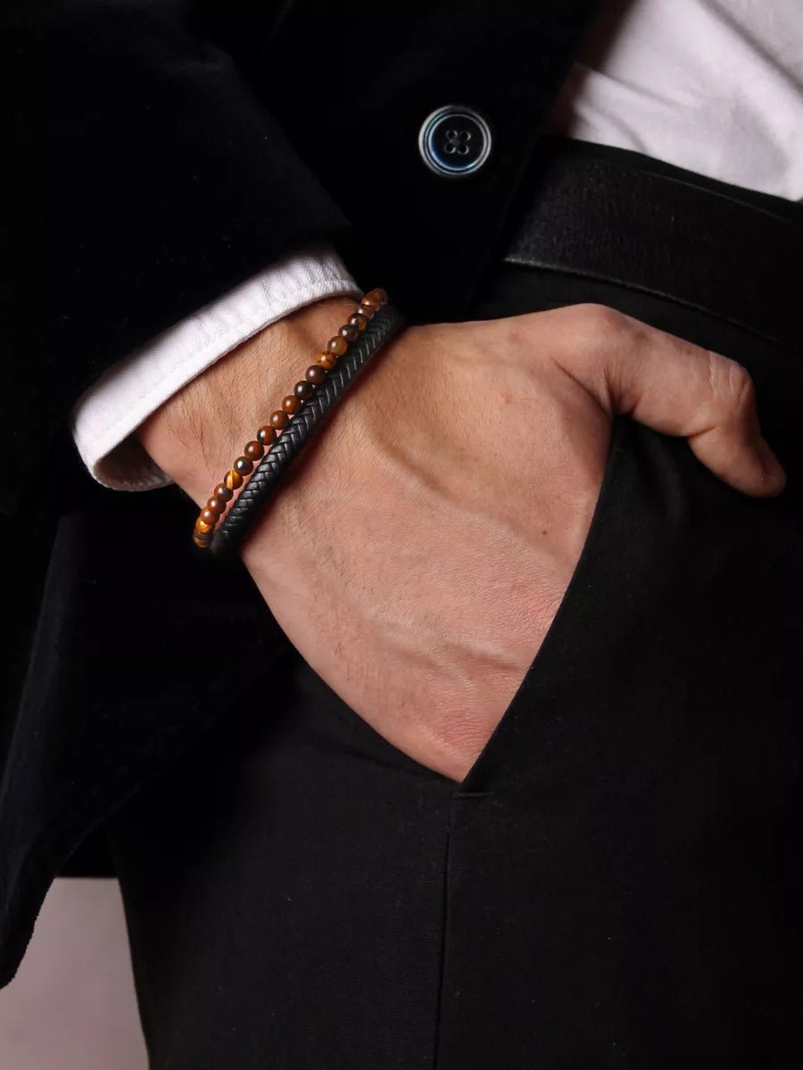 Scoprite un bracciale dal design elegante e audace, che unisce la forza della pelle intrecciata alla protezione delle pietre naturali. Questo gioiello maschile è pensato per valorizzare ogni abbinamento con il suo stile raffinato e la sua energia unica.