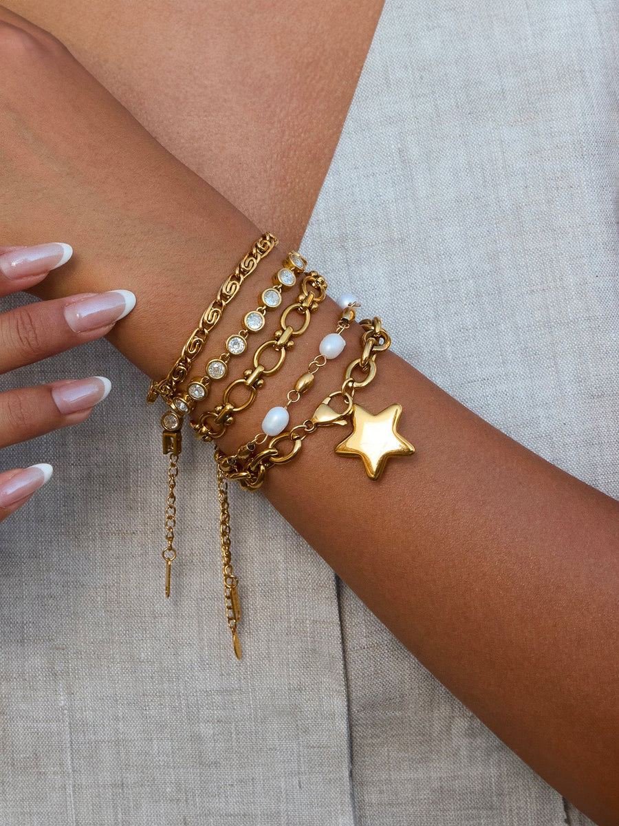 Lasciatevi conquistare da questo bracciale a maglie dorate impreziosito da un pendente a forma di stella, pensato per illuminare i vostri outfit quotidiani così come le vostre serate. Realizzato in acciaio inossidabile, unisce robustezza, brillantezza e comfort, risultando al tempo stesso anallergico e resistente all’acqua.