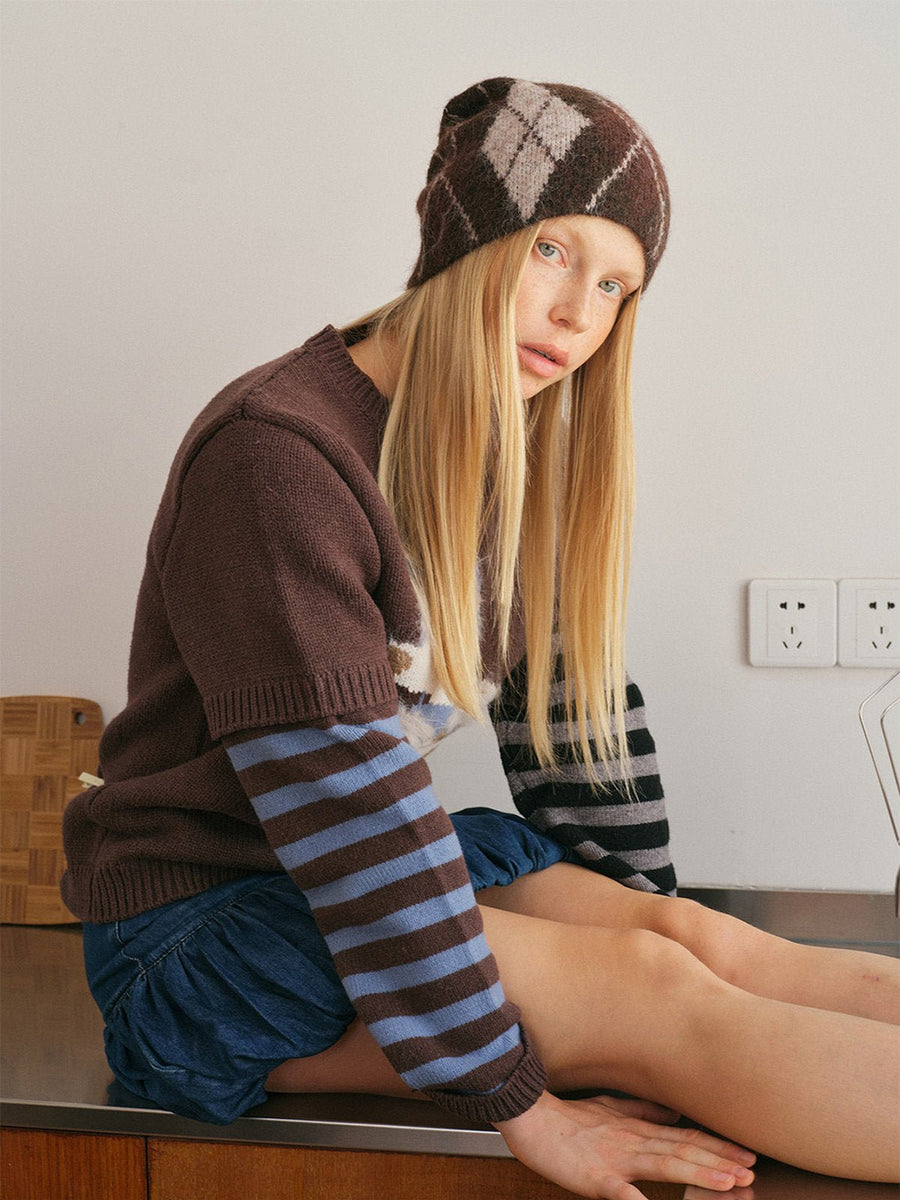 Il motivo argyle rivisitato dona uno stile deciso, a metà tra ispirazione rétro e universo streetwear contemporaneo. Questo berretto senza bordo si abbina facilmente a un look invernale casual. Disponibile in due tonalità intense — blu-grigio notte e marrone-caffè — offre un effetto visivo testurizzato grazie alla sua lavorazione a maglia ricca di rilievi.