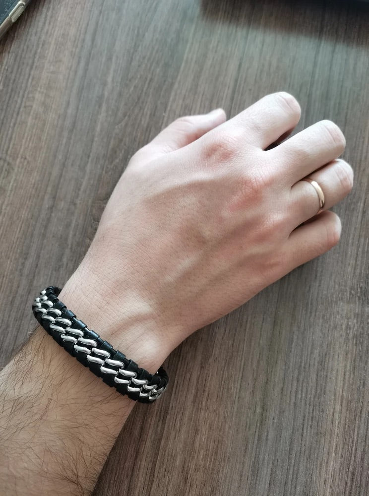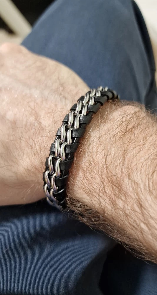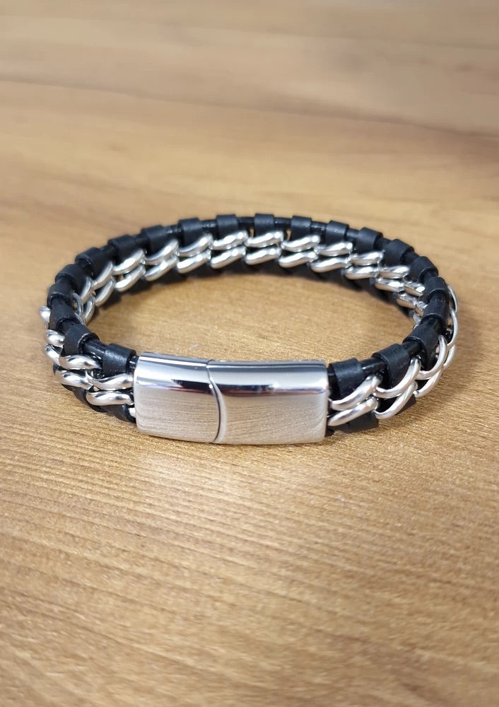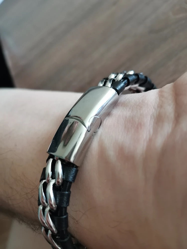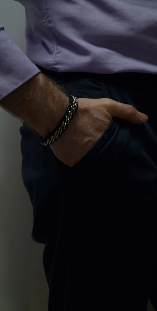 Questo bracciale in vera pelle intrecciata con catena in titanio è l’accessorio perfetto per valorizzare il polso dell’uomo moderno. Il suo design curato unisce la morbidezza della pelle alla robustezza dell’acciaio, creando un gioiello al tempo stesso elegante e audace.