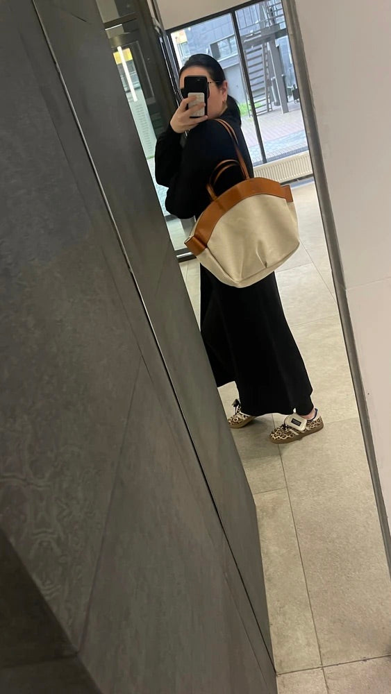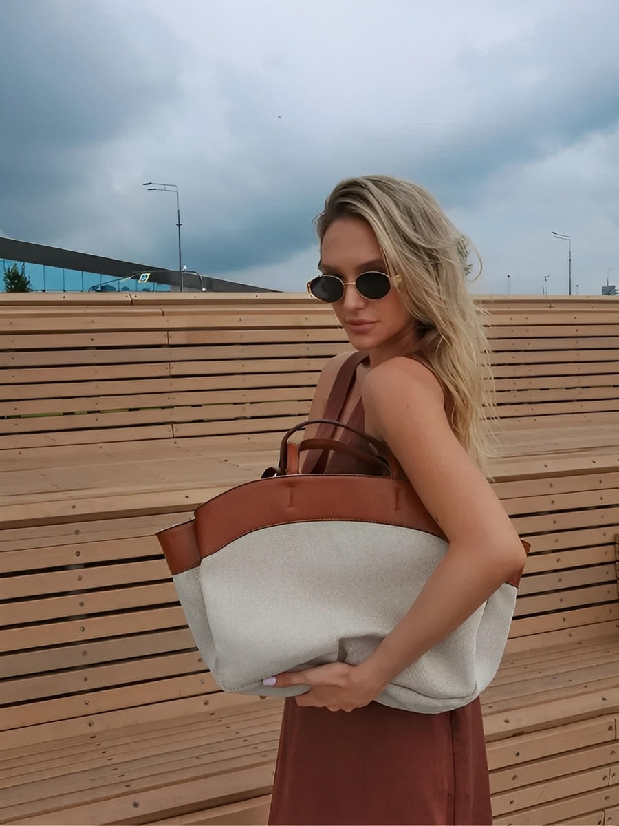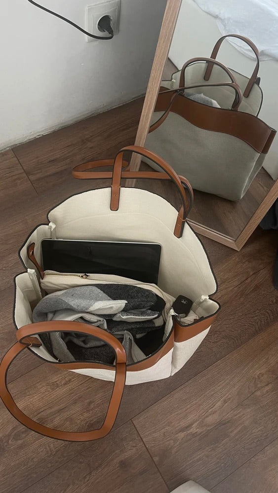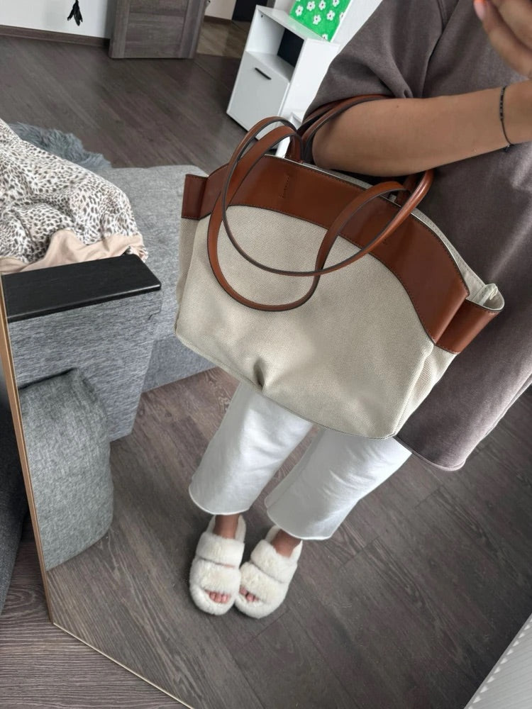 Questa borsa shopper unisce un volume generoso a un design grafico per accompagnare tutte le vostre giornate attive. La sua struttura in tela canvas spessa è valorizzata da manici e finiture in similpelle a contrasto, che donano carattere e modernità alla silhouette.