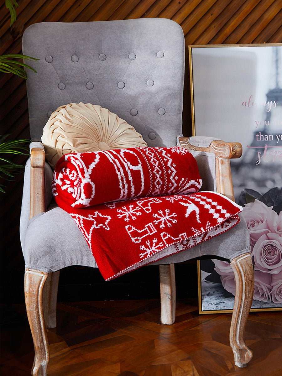 Trasformate il vostro ambiente in un vero e proprio rifugio invernale con questo plaid rosso dai motivi natalizi. Decorato con cervi, campane, fiocchi di neve e piccole calze, incarna lo spirito caloroso delle festività di fine anno.