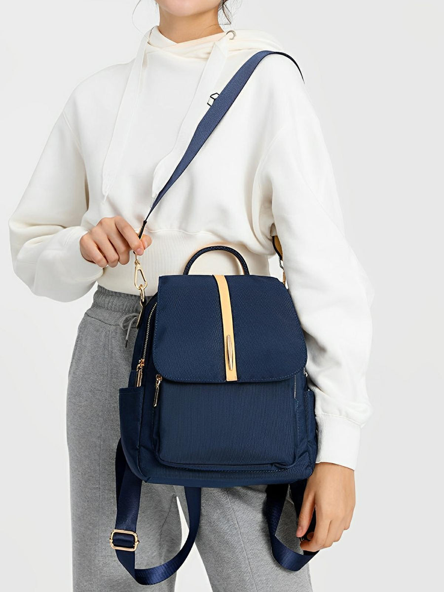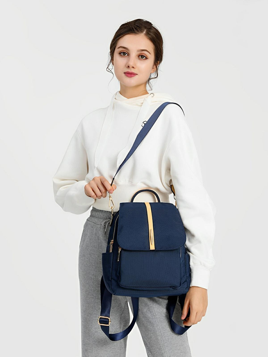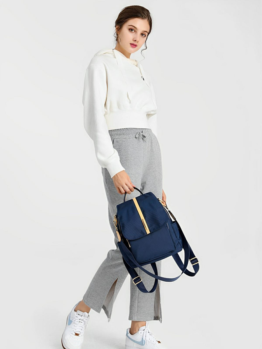 Adottate lo zaino da donna compatto pensato per le vostre giornate intense. Realizzato in nylon resistente e impermeabile, vi accompagna con qualsiasi tempo senza rinunciare allo stile. Con il suo design essenziale e la tonalità blu profonda, questo zaino si adatta sia a una giornata di lavoro che a una fuga urbana.