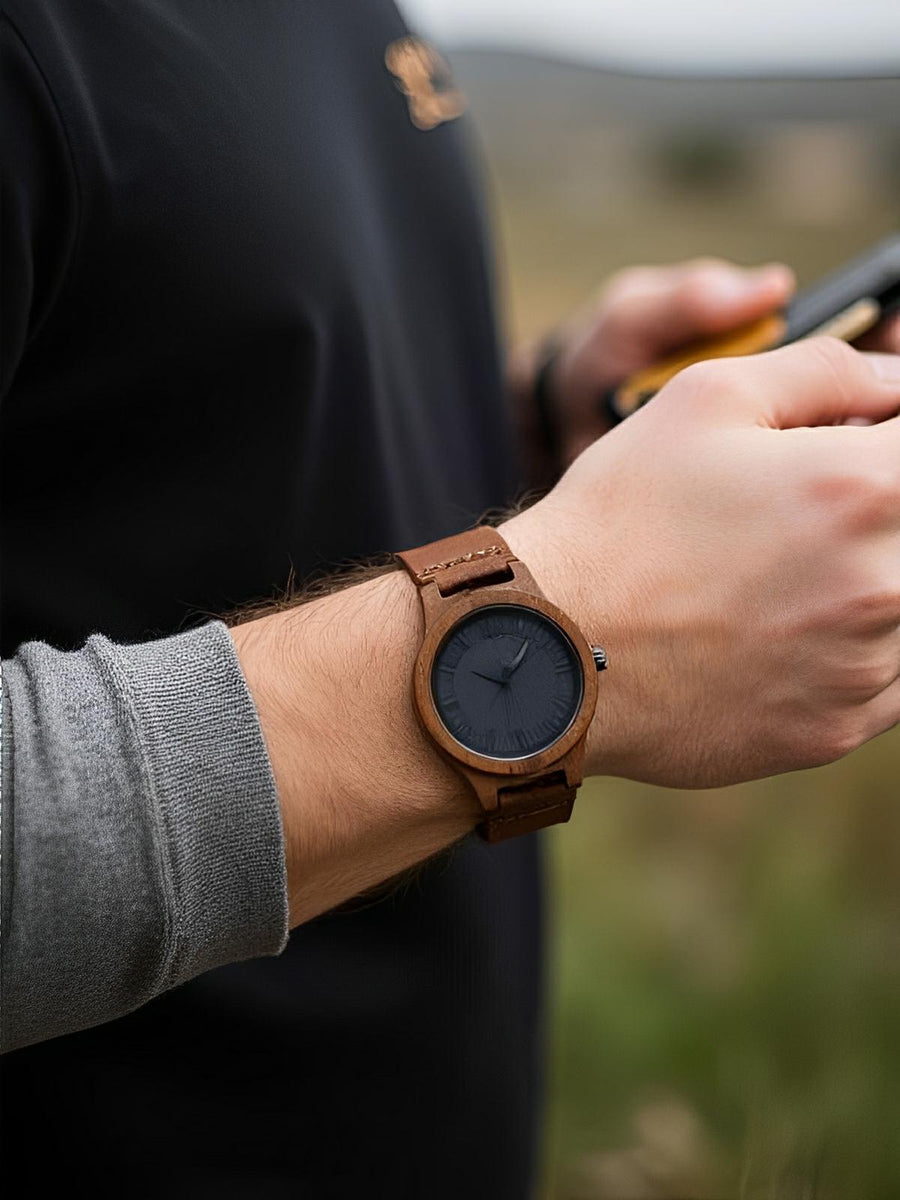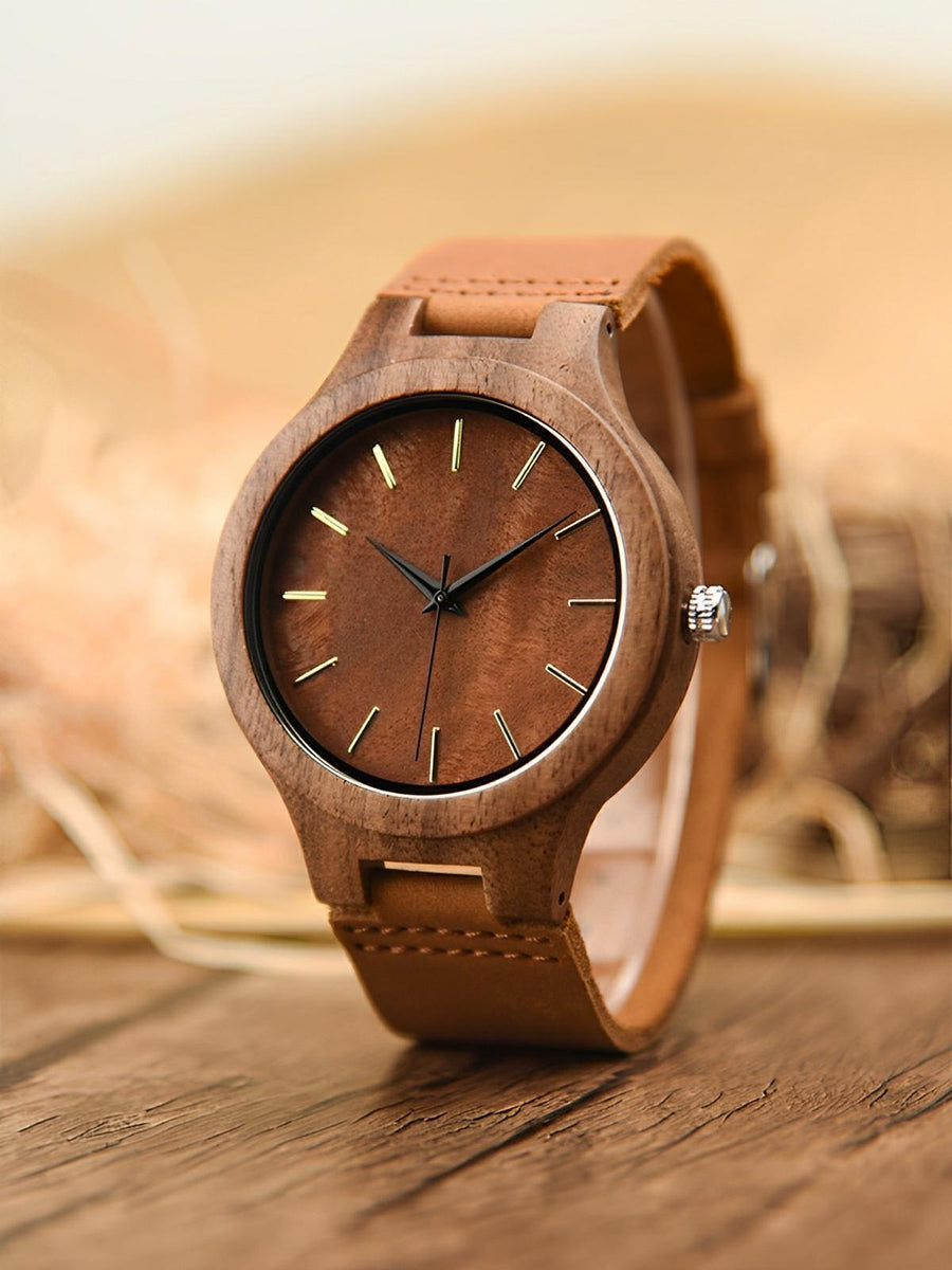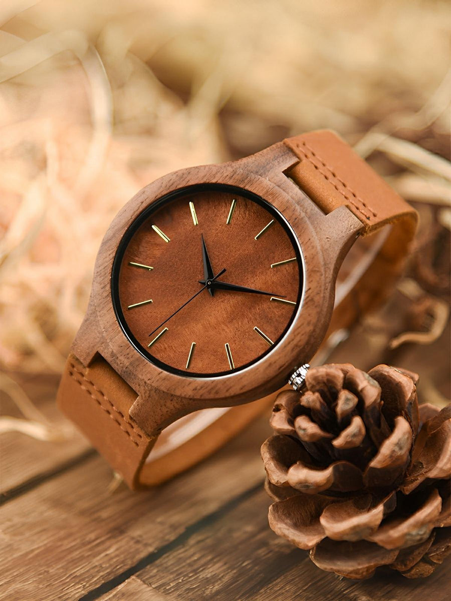 Scoprite un orologio in legno unico, che unisce un design minimalista a materiali naturali per uno stile autentico e raffinato. Il suo quadrante in legno finemente scolpito rivela calde sfumature, esaltate da un cinturino in vera pelle per un comfort ottimale ogni giorno.