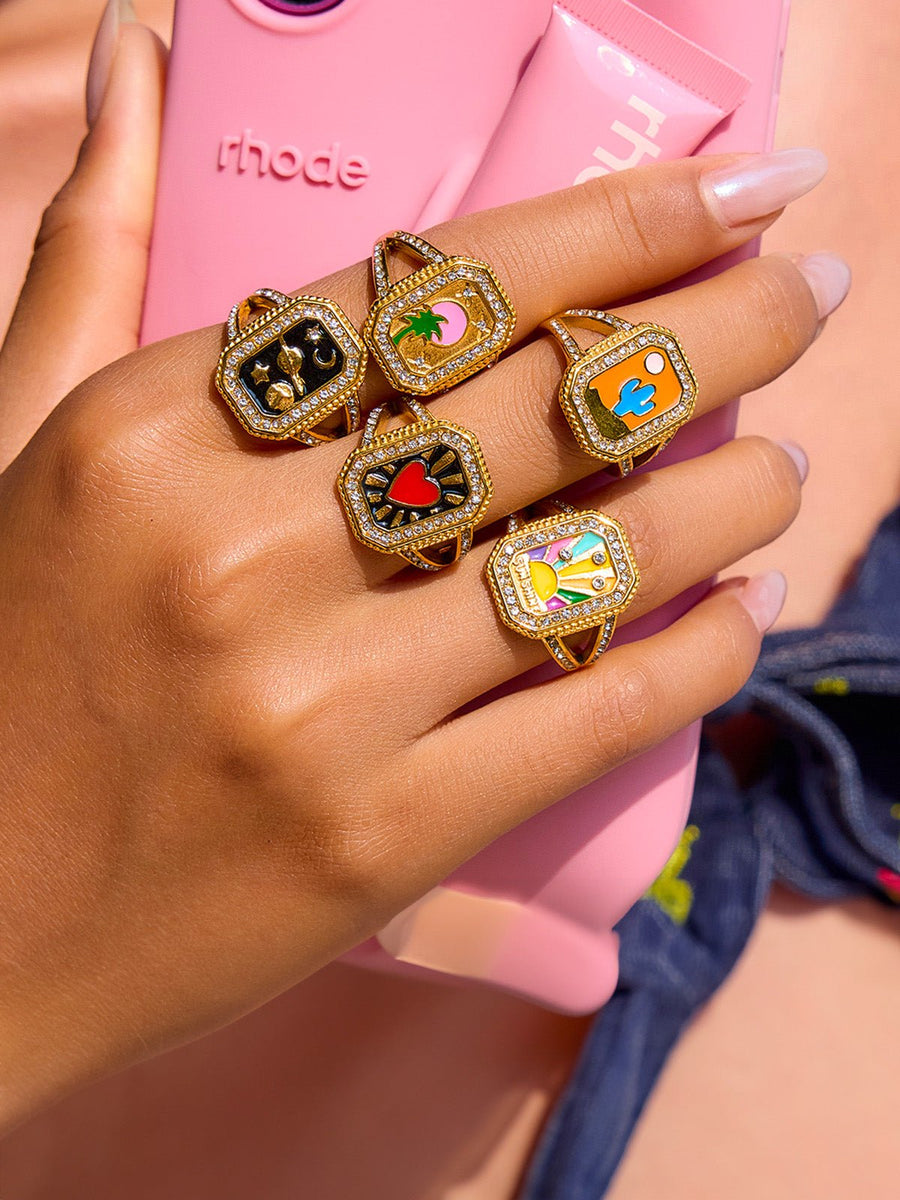 Affermate la vostra personalità con questo anello audace e vibrante, vero concentrato di energia visiva. Ogni modello presenta un motivo colorato unico — cuore, cactus, astri, sole, palma — incastonato in un contorno geometrico sottolineato da strass luminosi.