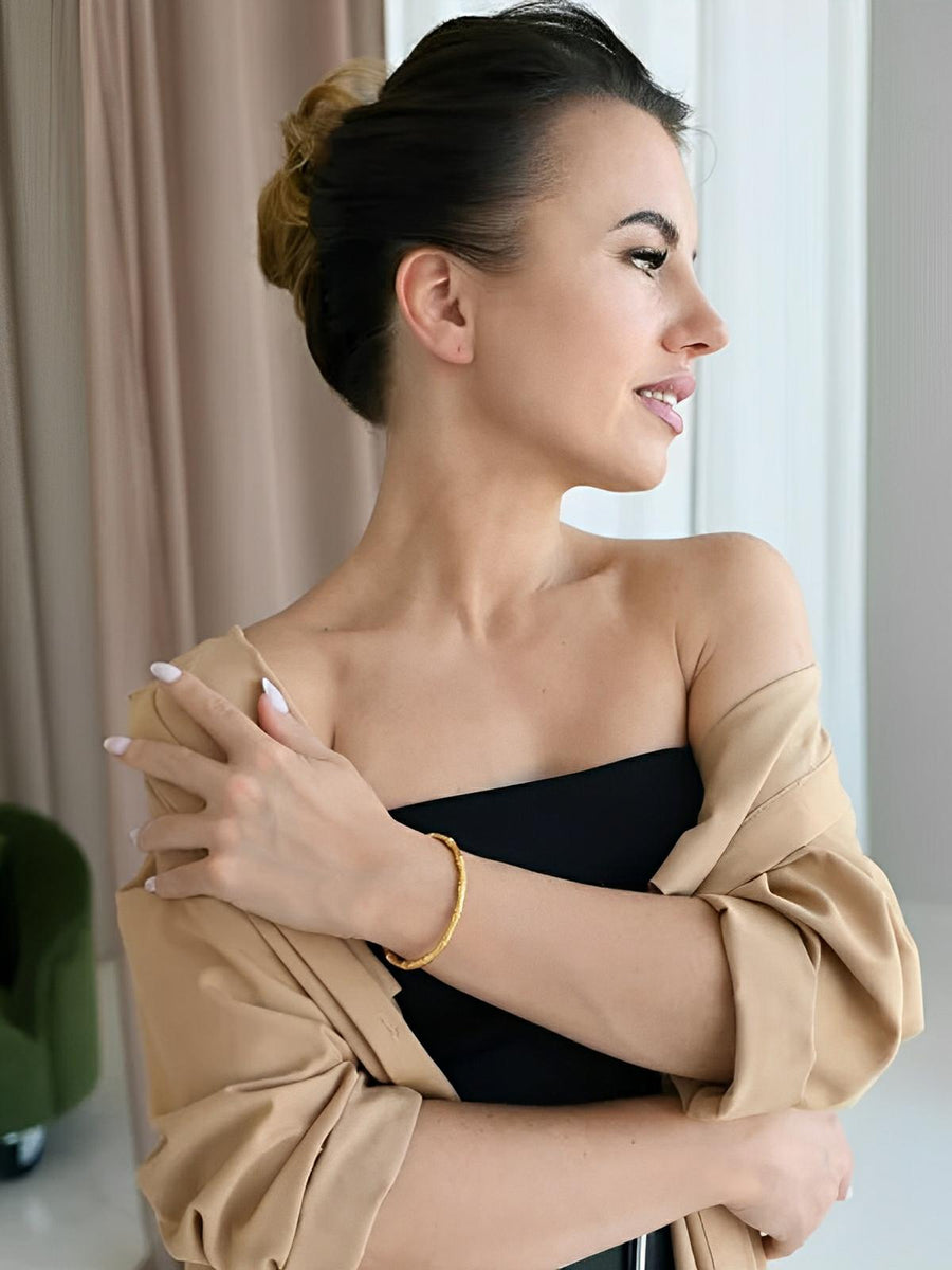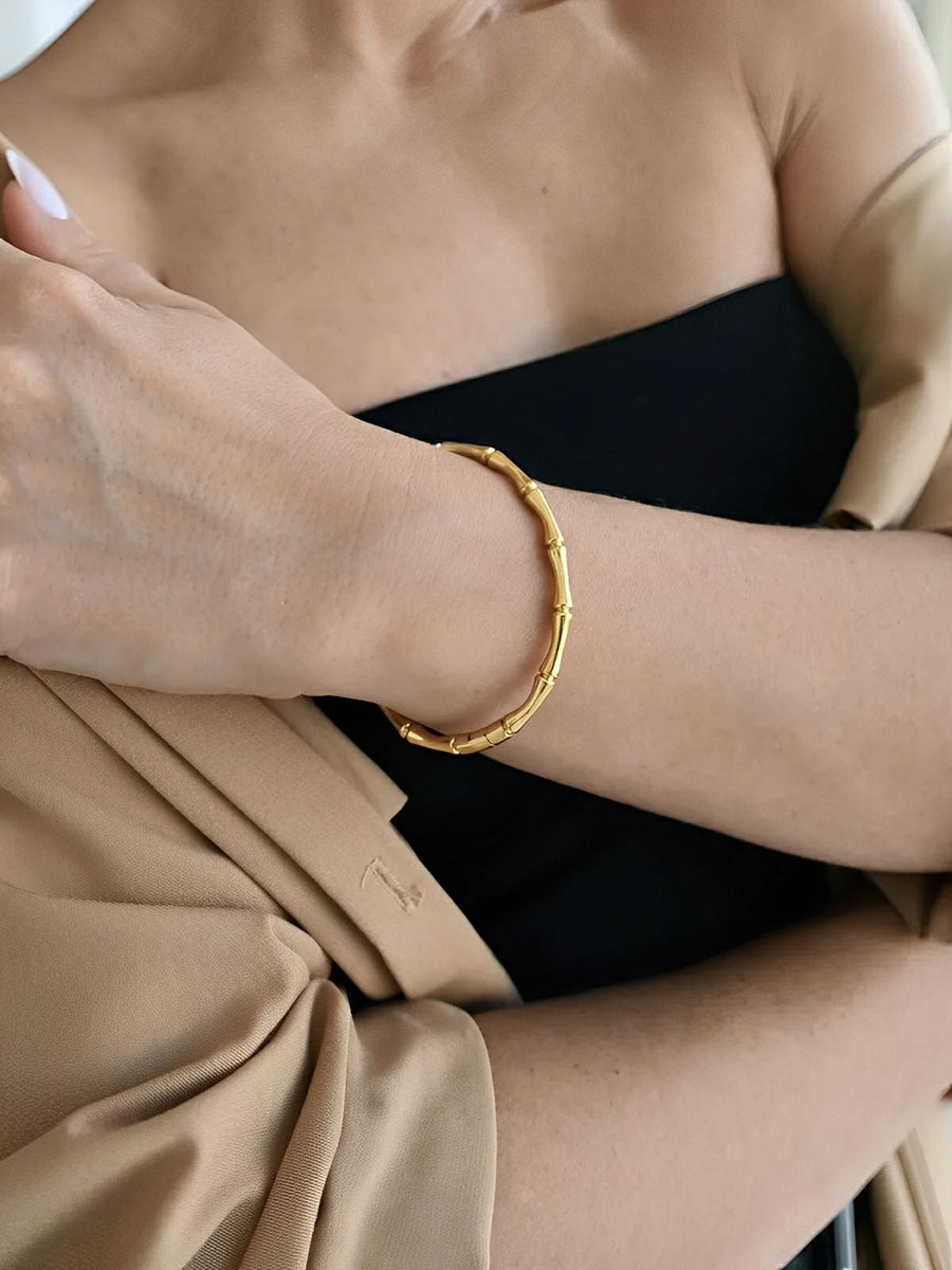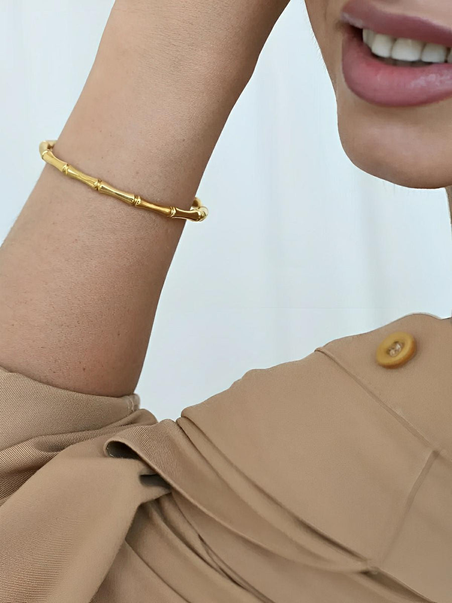 Questo bracciale rigido a forma di bambù incarna l’essenza dello stile Old Money con un tocco contemporaneo. Realizzato in acciaio titanio placcato, unisce resistenza e raffinatezza per offrire una brillantezza duratura, senza perdere lucentezza nel tempo. Leggero e confortevole, si adatta ai polsi da 15 a 18 cm senza chiusura visibile, garantendo una vestibilità naturale e fluida.