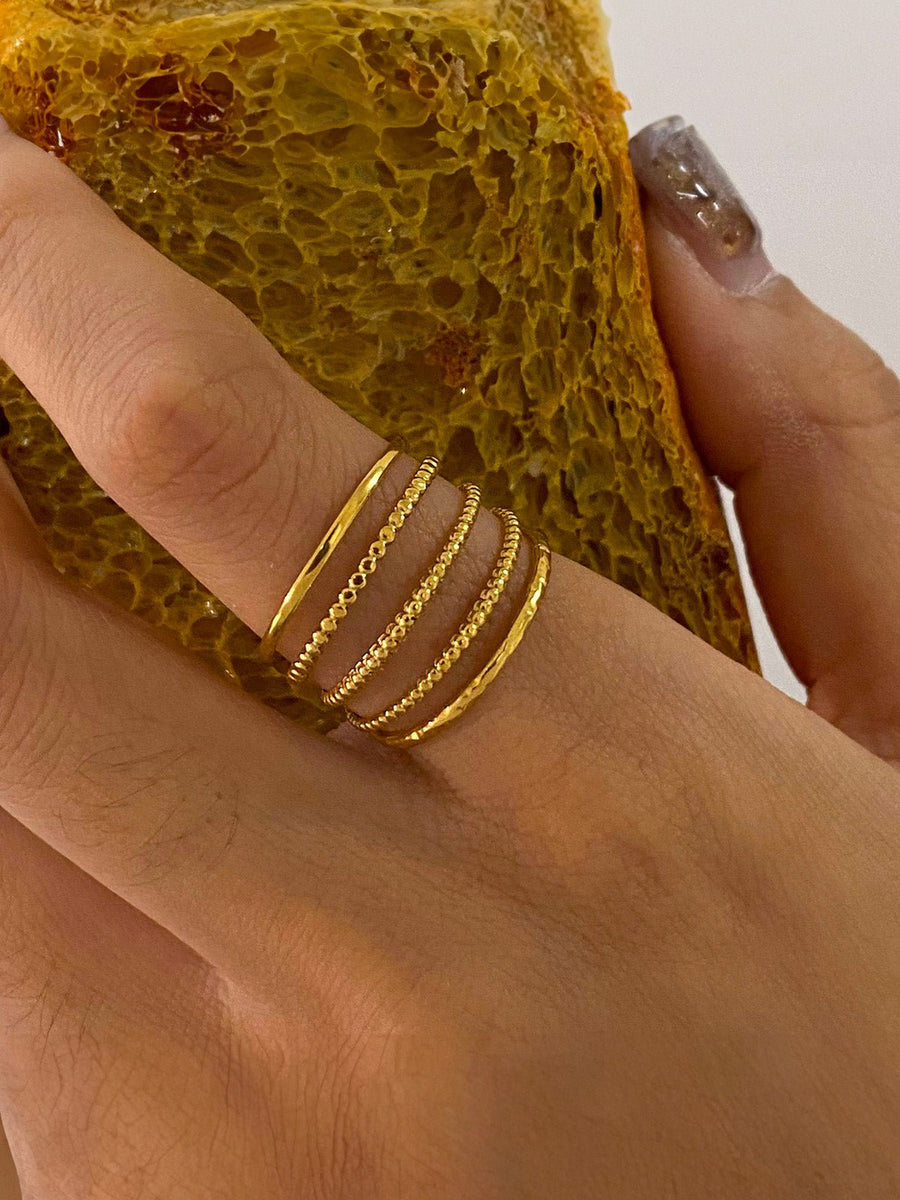 Realizzato in acciaio inossidabile placcato oro 18K, questo anello è sia anallergico che resistente all’acqua, per una tenuta impeccabile anche in estate o sotto la pioggia. Indossatelo da solo per un look minimalista oppure abbinatelo ad altri modelli per uno stile più deciso.