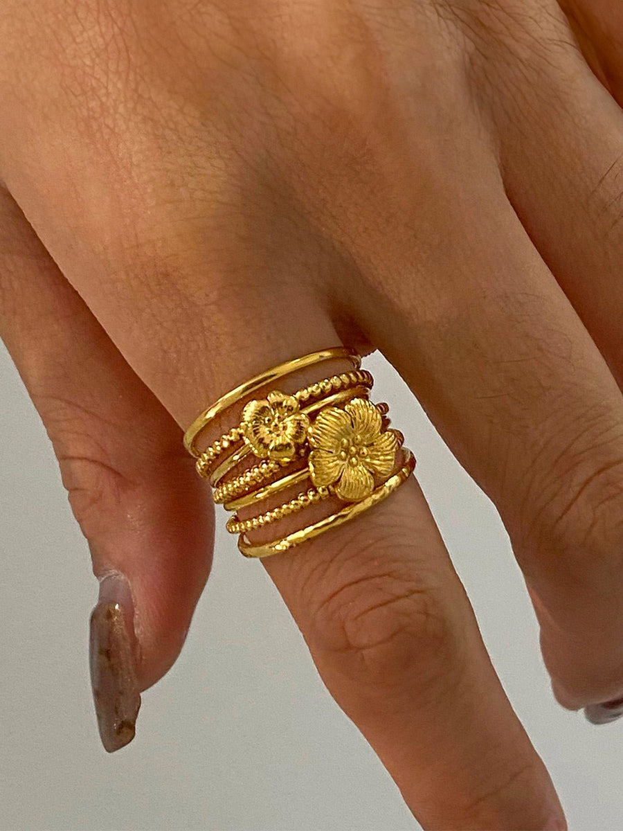Lasciatevi conquistare da questo anello floreale dorato dal fascino deciso. Il suo design con sovrapposizione di sottili linee testurizzate richiama sia la delicatezza della natura che l’audacia del gioiello contemporaneo.