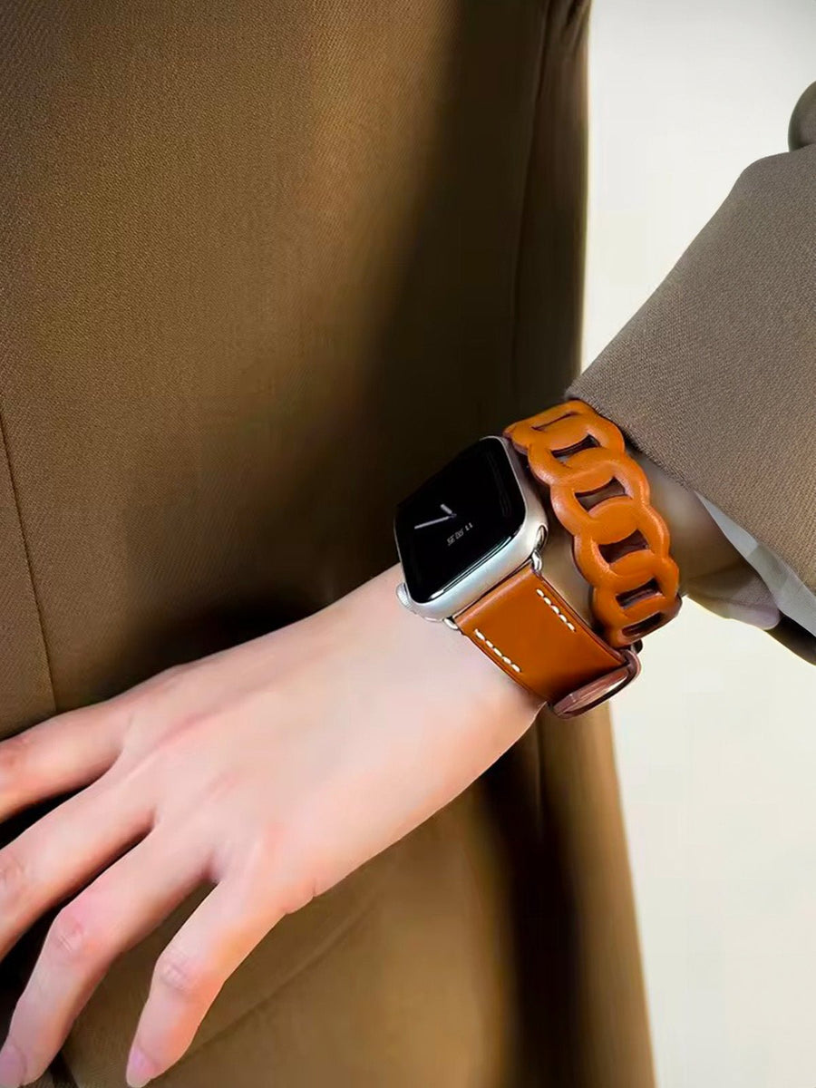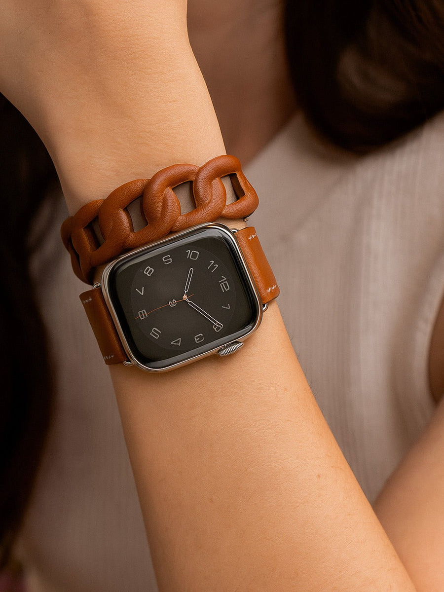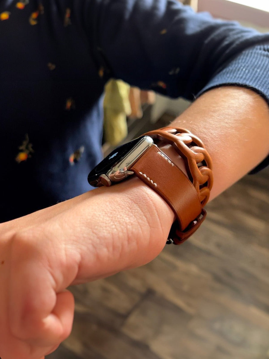 Questo bracciale doppio giro in pelle dona un tocco distintivo al vostro Apple Watch grazie al suo design raffinato e audace. Progettato per adattarsi comodamente al polso, combina una fascia liscia e una sezione a maglie larghe per un effetto unico.