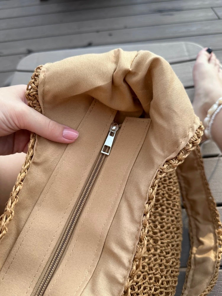 L’intreccio in fibre di carta offre uno stile naturale e strutturato che si abbina perfettamente ai vostri abiti leggeri. All’interno, una fodera in tessuto morbido protegge i vostri effetti personali e integra tre scomparti pratici: una tasca con zip per gli oggetti di valore e due tasche aperte per telefono, chiavi o occhiali.