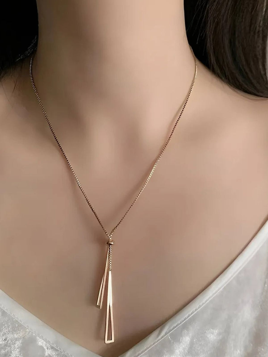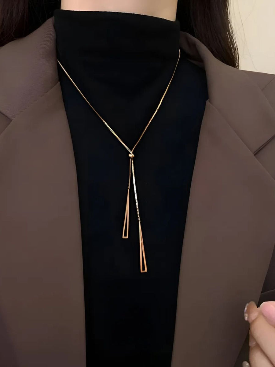 La catena sottile dona un effetto arioso e delicato, mentre i due pendenti triangolari aggiungono un tocco grafico e audace. Questo modello si indossa sia su un dolcevita che su una scollatura, grazie al suo fermaglio clip regolabile che si adatta perfettamente ai vostri desideri.