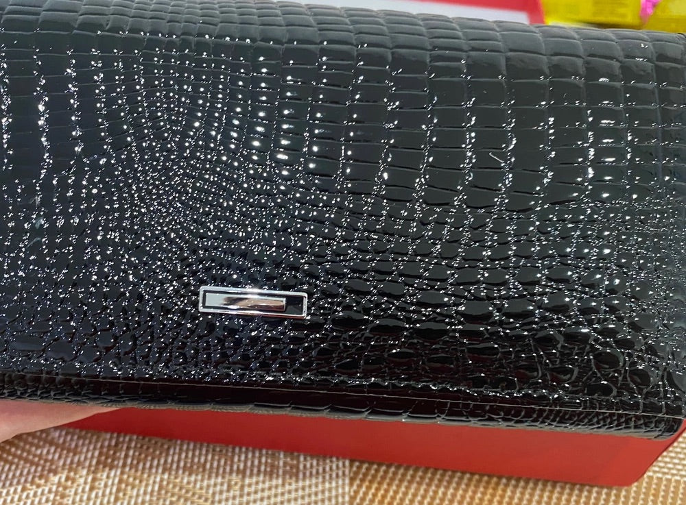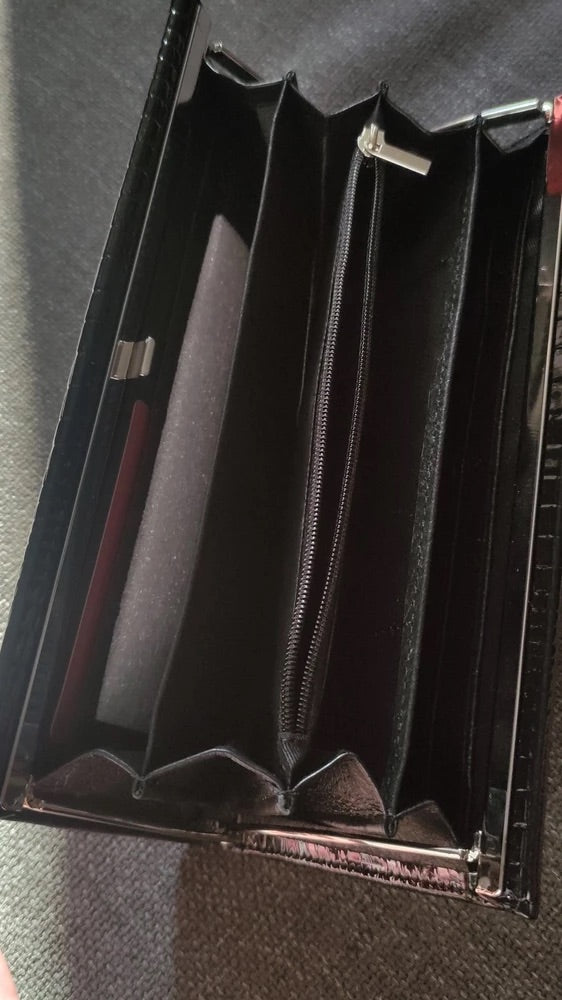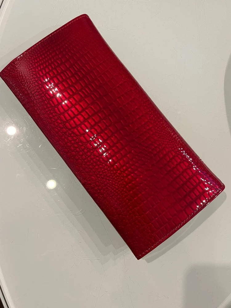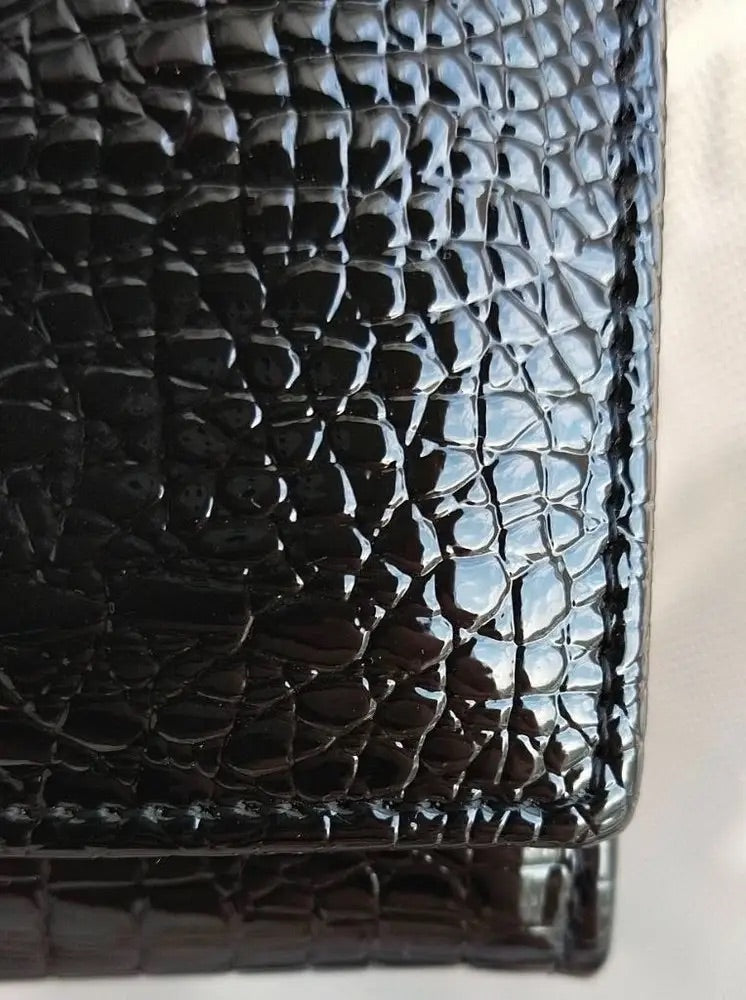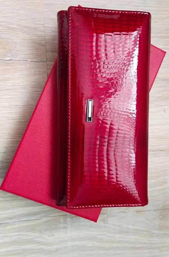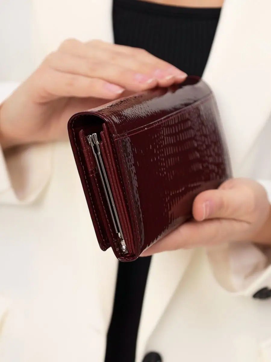 Scoprite questo portafoglio da donna in pelle verniciata dal formato lungo, pensato per chi cerca sia stile che funzionalità. La sua finitura lucida effetto rettile cattura la luce e attira lo sguardo, mantenendo al contempo una presa piacevole.