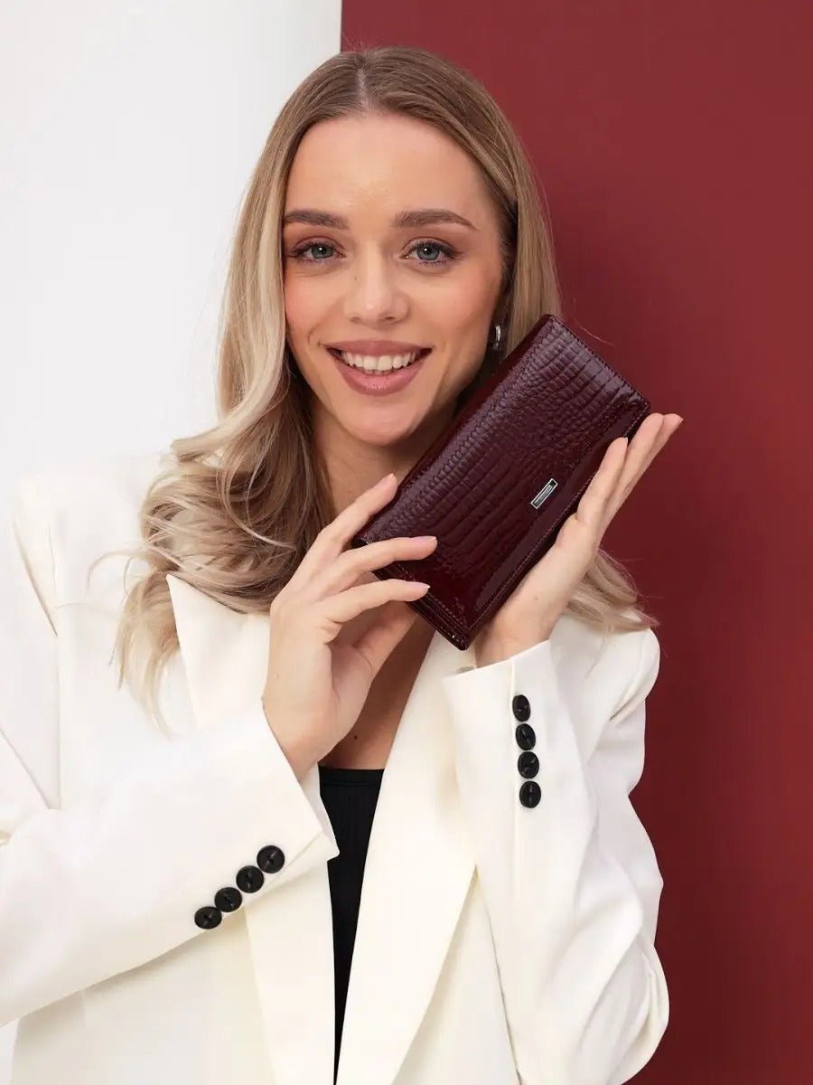 Portafoglio donna in pelle verniciata effetto coccodrillo, formato grande, chiusura magnetica, portamonete integrato, multi-carte, modello Felicia