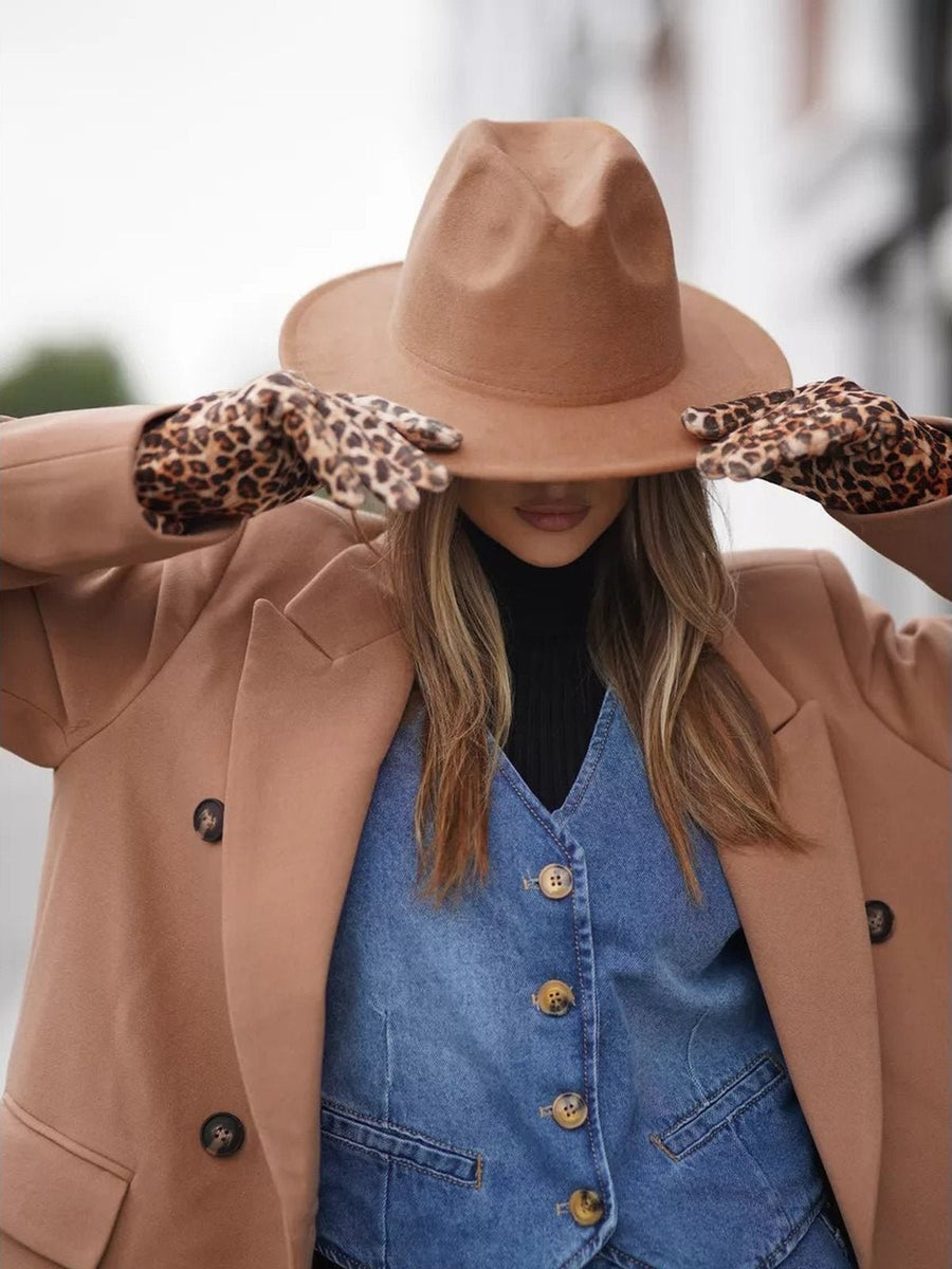 La sorpresa si cela sotto la falda: una audace stampa leopardata riveste l’interno per una finitura inaspettata e ricca di carattere. Questo dettaglio unico valorizza l’insieme e conferisce al fedora un carattere double-face di grande impatto visivo.