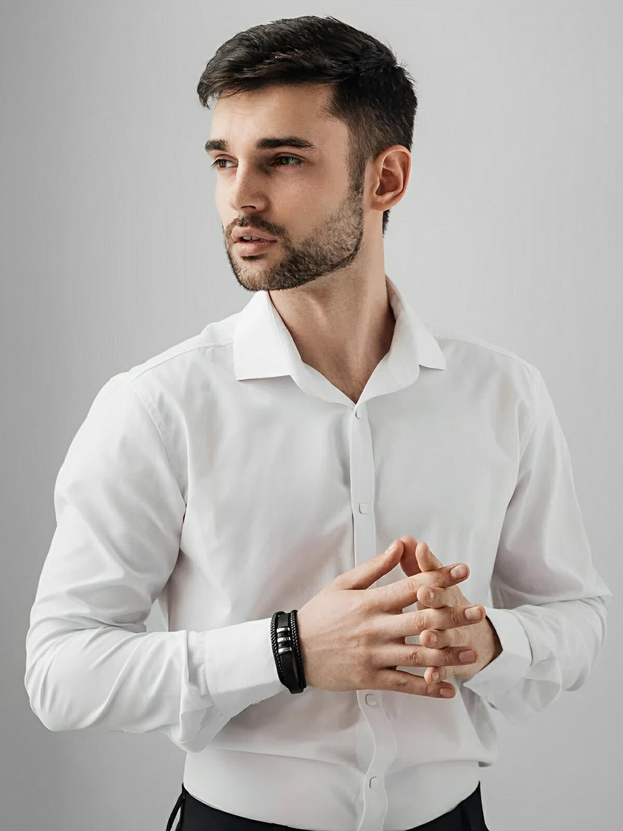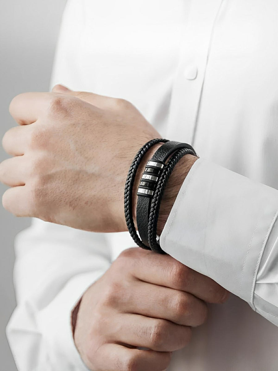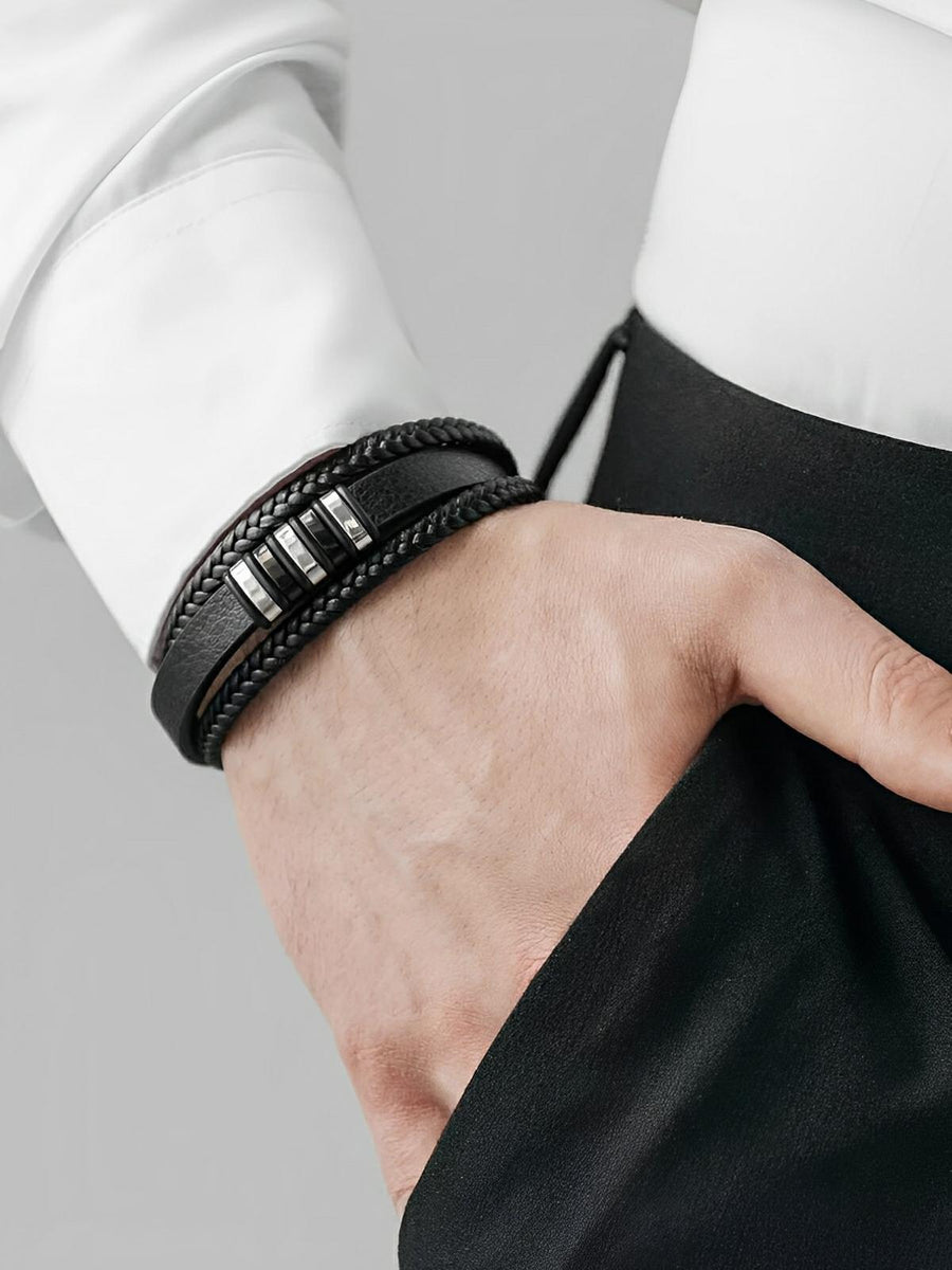 Questo bracciale in pelle nera intrecciata è un accessorio sofisticato pensato per gli uomini che cercano il perfetto equilibrio tra robustezza ed eleganza. Il suo design multigiro combina pelle intrecciata e una striscia liscia, valorizzate da elementi in acciaio inox che aggiungono un tocco distintivo.