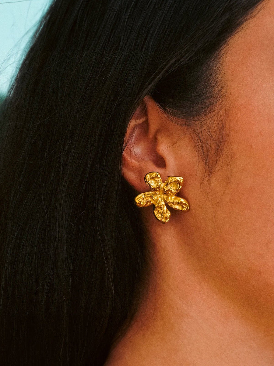 Aggiungete un tocco di calore solare ai vostri outfit con questi orecchini a forma di fiore dorato a cinque petali. La loro texture martellata richiama la materia grezza, scolpita in un’energia organica e luminosa.