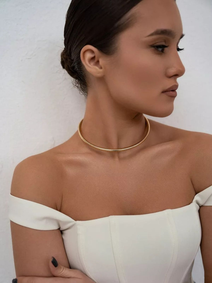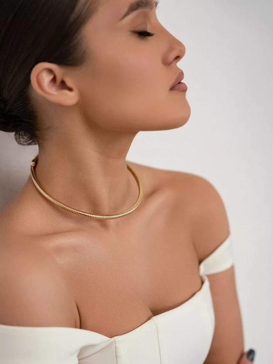 Questo collier girocollo dorato incarna il tocco moderno e luminoso che valorizza ogni outfit. Realizzato in acciaio inossidabile, offre un comfort assoluto anche alle pelli più sensibili. Il suo design a cerchio rigido, impreziosito da estremità corte e aperte, segue naturalmente la linea del collo e si adatta facilmente a diverse morfologie.