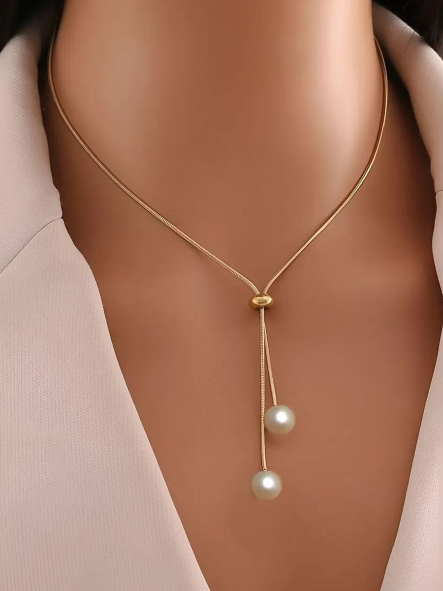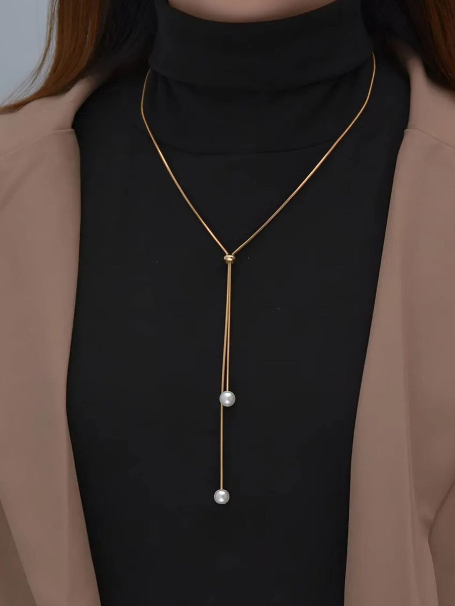 Scoprite questa collana lunga dorata pensata per valorizzare ogni vostro outfit con un tocco di luce. Realizzata in acciaio al titanio e impreziosita da perle sintetiche, questo accessorio si distingue per la sua semplicità raffinata e il suo forte impatto visivo. La catena stile ossi di serpente dona un volume morbido e moderno, perfetto per strutturare i vostri look con eleganza.