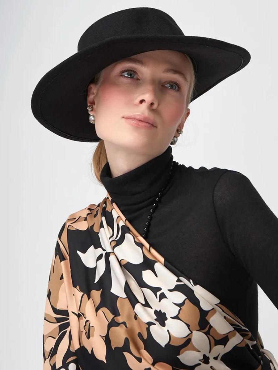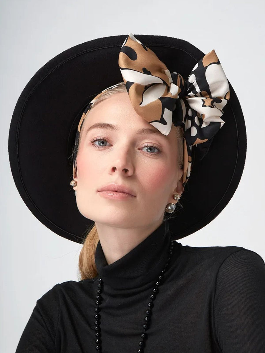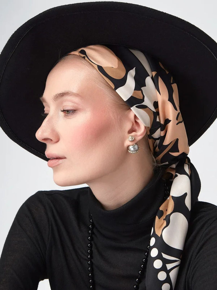 Il suo motivo floreale grafico gioca sui contrasti di nero, beige, bianco e cammello, creando un accessorio visivamente d’impatto, capace di trasformare un outfit semplice in una silhouette decisa. Indossato come bandana, turbante, scialle leggero o foulard religioso, si adatta a ogni desiderio e occasione.