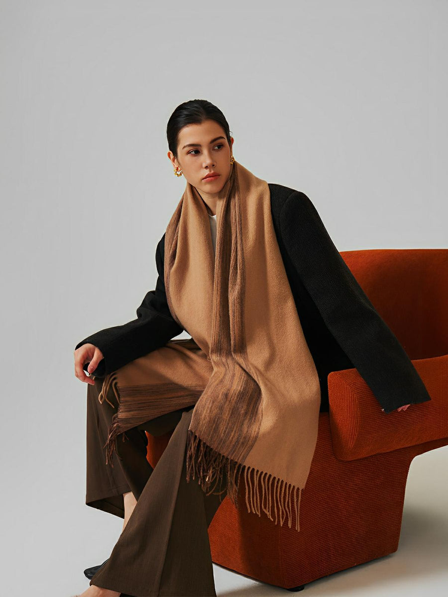 Sciarpa 100% lana calda da donna, finitura con frange, motivo cammello e marrone, morbidezza invernale di lusso, modello Galia