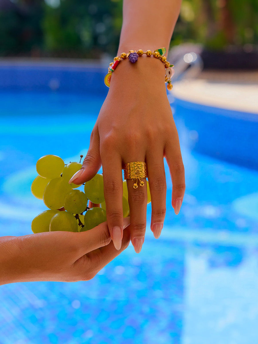 Questo anello doratо si distingue per il suo design audace e fruttato: un ciondolo a ciliegia in rilievo sospeso a un anello dalla texture martellata. Realizzato in acciaio inossidabile con placcatura in oro 18K, unisce robustezza ed estetica moderna.