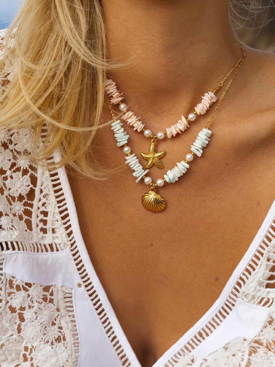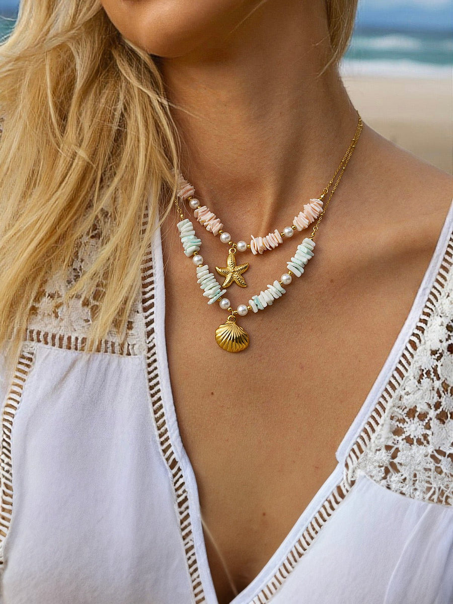 Questa collana unisce accenti marini e design di tendenza in una composizione audace e luminosa. La catena sottile dorata valorizza una successione di conchiglie rosa levigate, accompagnate da perle madreperlate e perle dorate, per un’estetica estiva e rinfrescante. Al centro, un ciondolo a stella marina dorata cattura lo sguardo e dona un tocco di carattere unico.