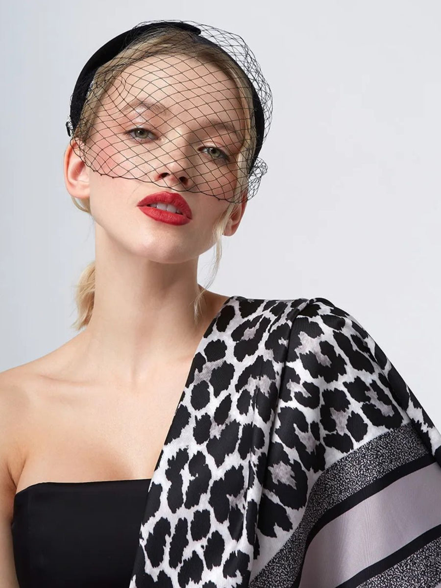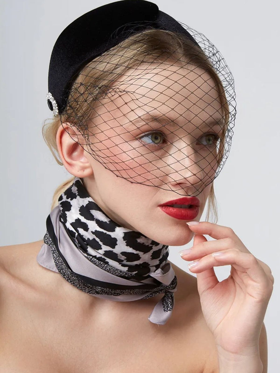 Foulard carré soyeux, stampa leopardata nera e grigia, foulard 90x90 cm, accessorio donna primavera estate, sciarpa leggera per collo, testa e spalle, modello Giselle