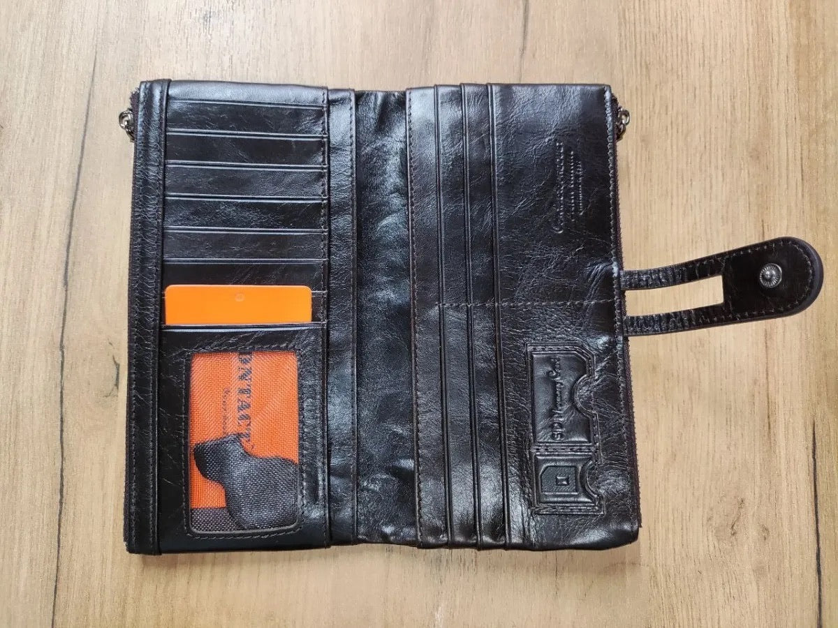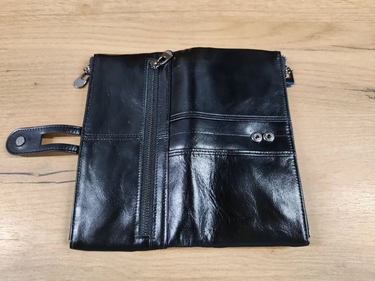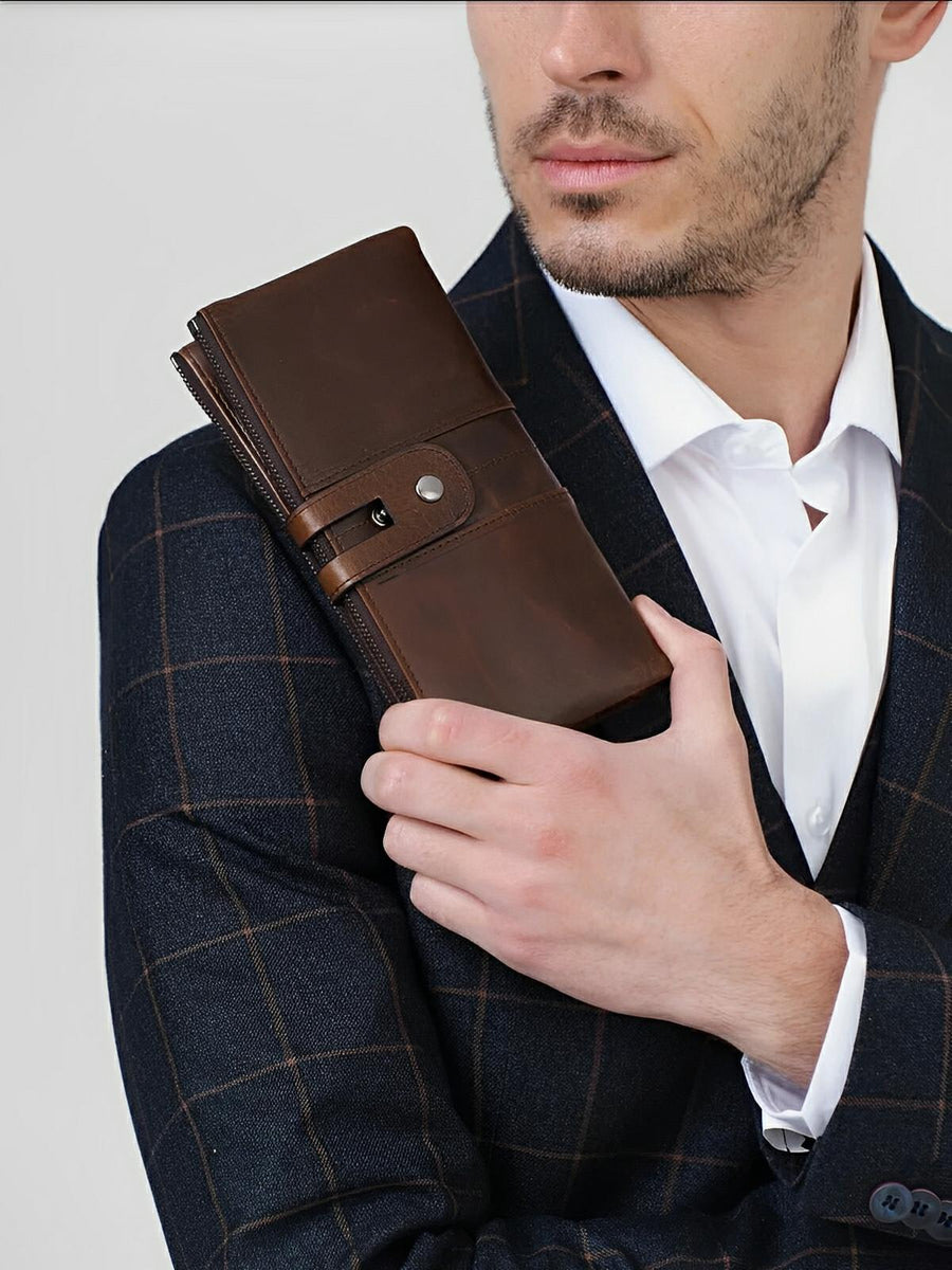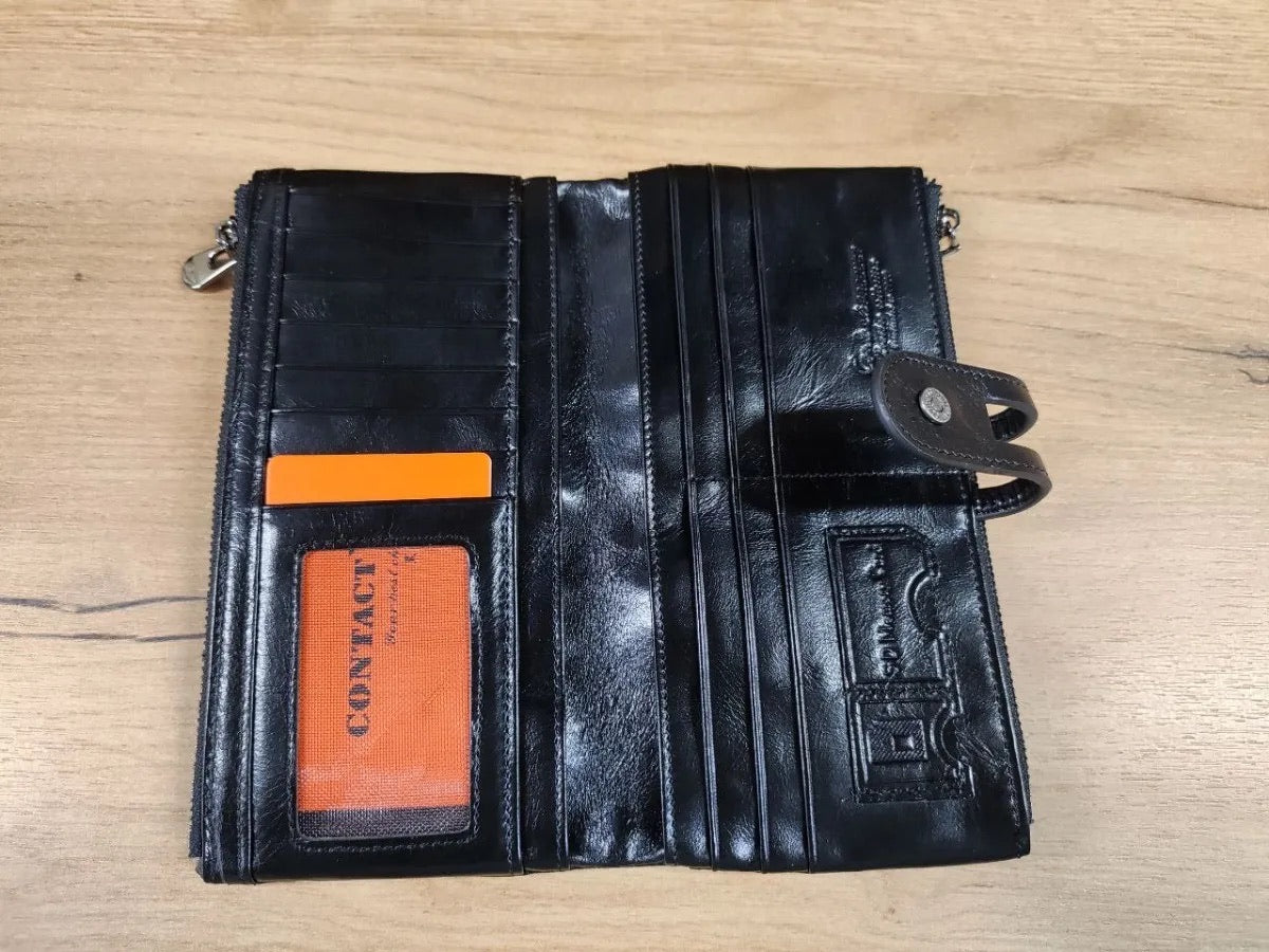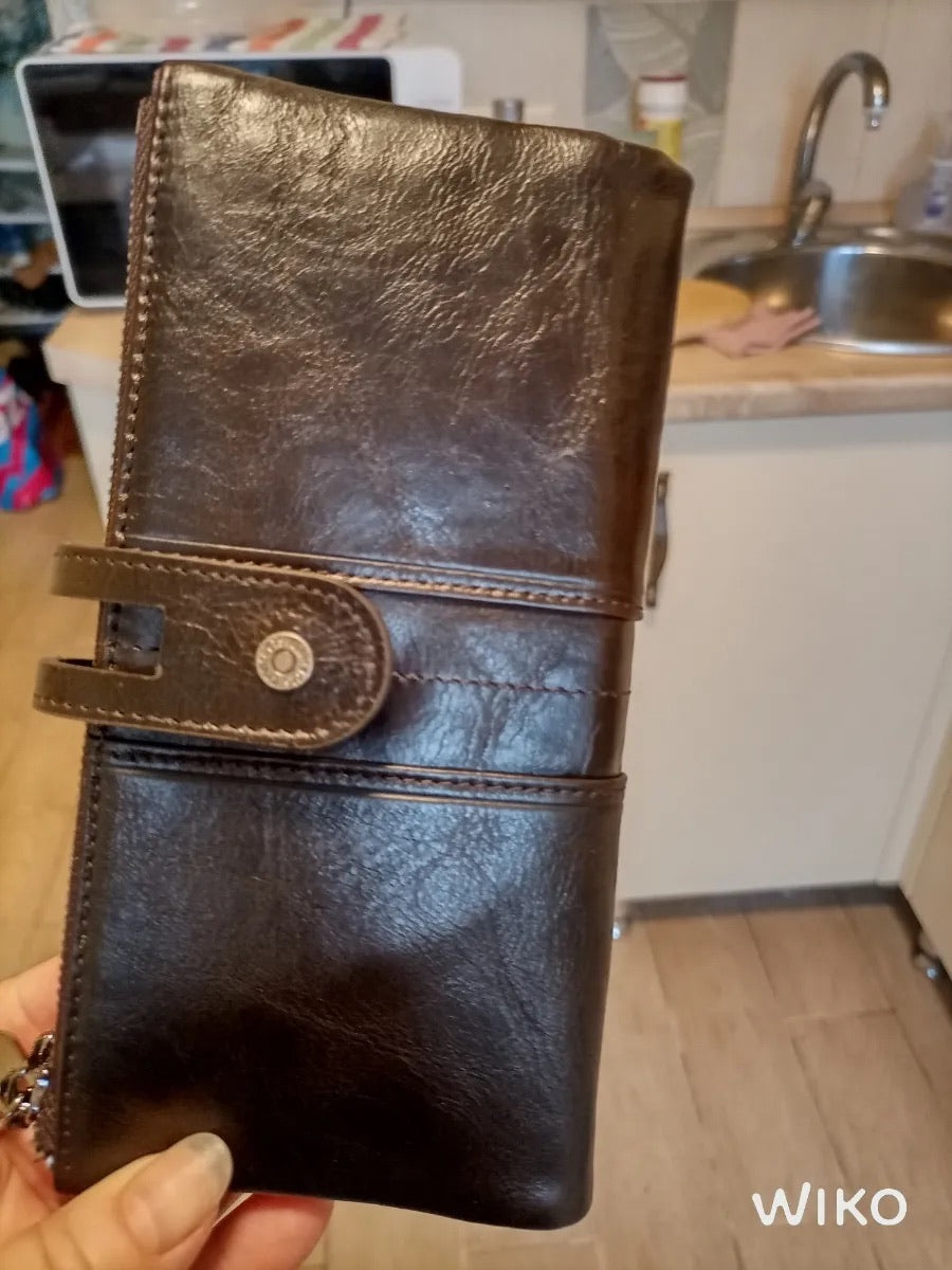 Il suo formato lungo e compatto si adatta a ogni occasione, scivolando facilmente in una borsa o tenendosi perfettamente in mano. Questo portafoglio è la scelta ideale per chi privilegia organizzazione e sicurezza senza rinunciare allo stile.