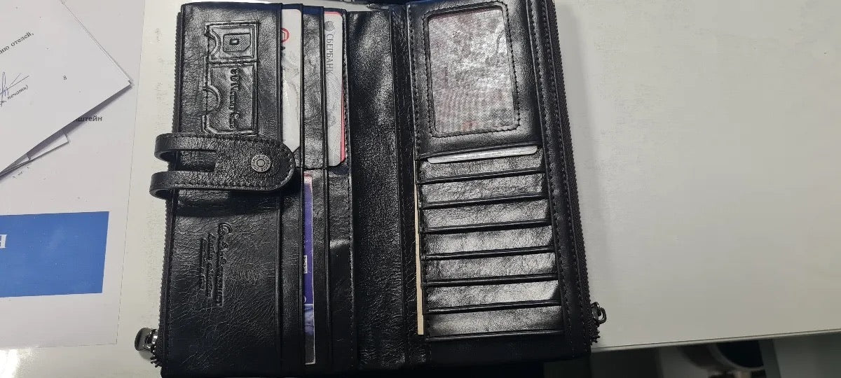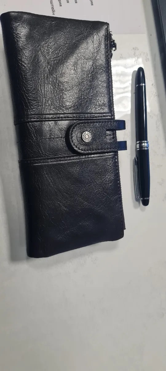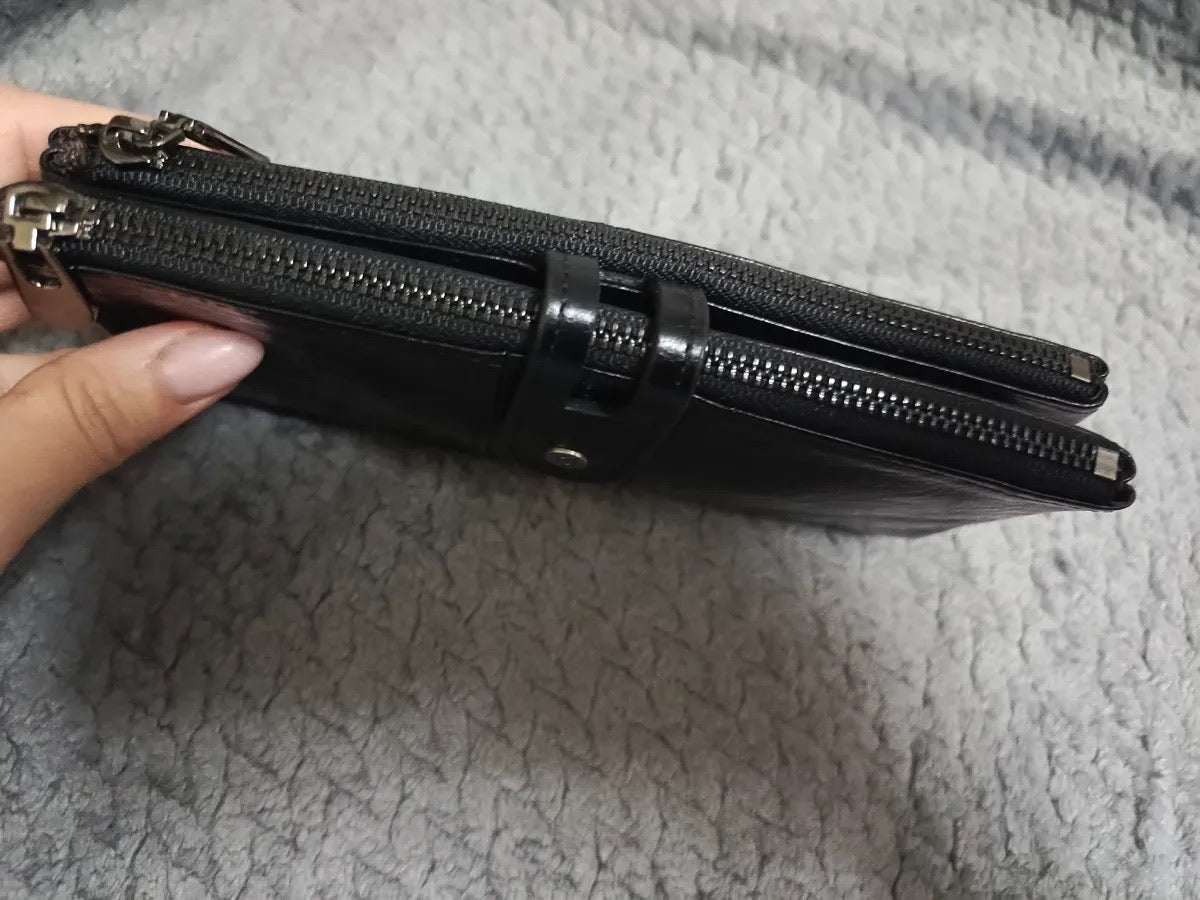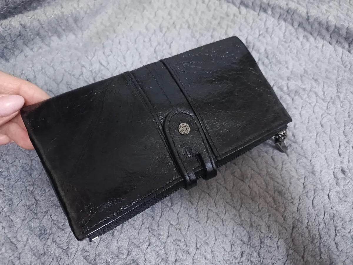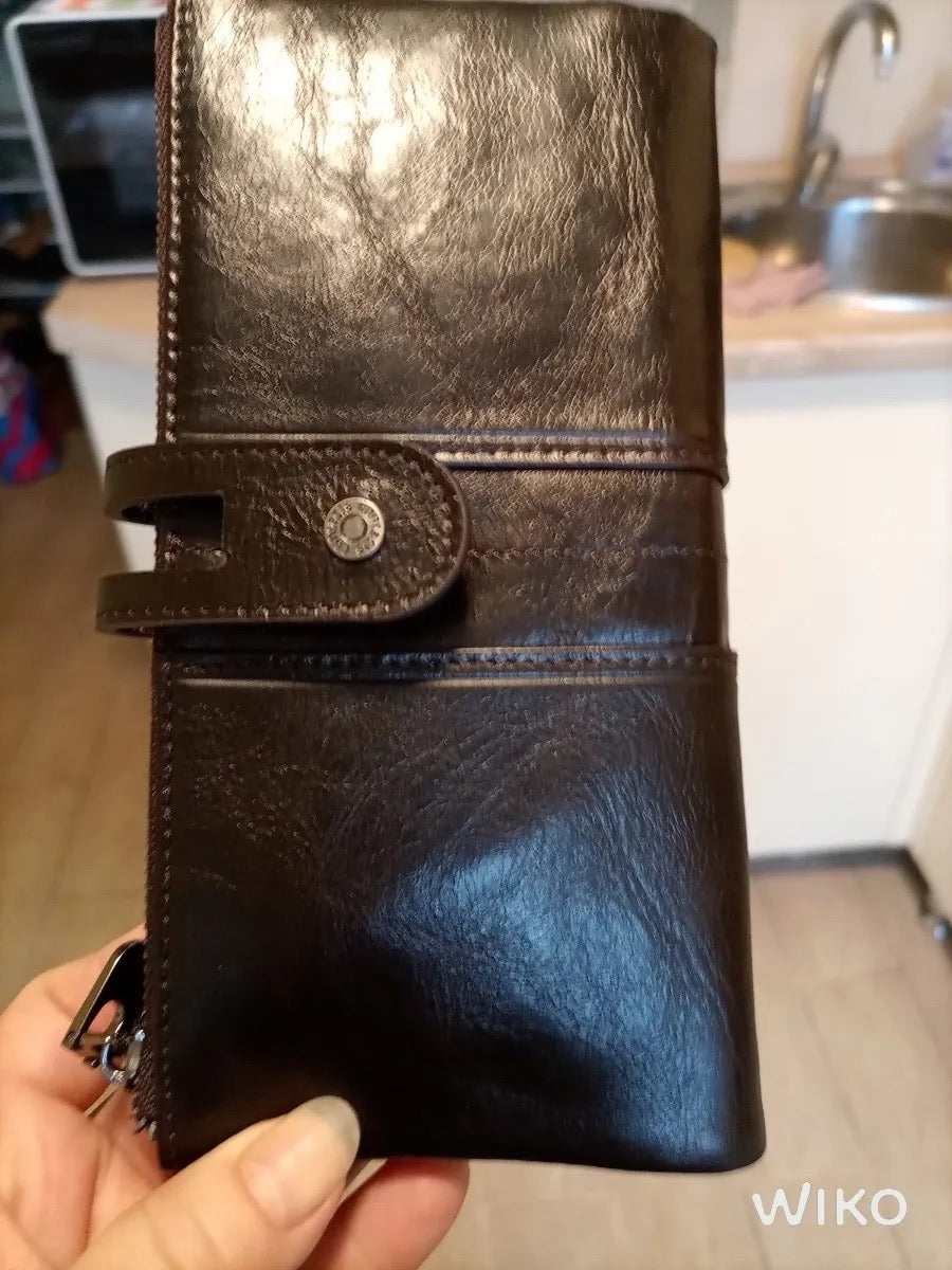 Il suo formato lungo e compatto si adatta a ogni occasione, scivolando facilmente in una borsa o tenendosi perfettamente in mano. Questo portafoglio è la scelta ideale per chi privilegia organizzazione e sicurezza senza rinunciare allo stile.
