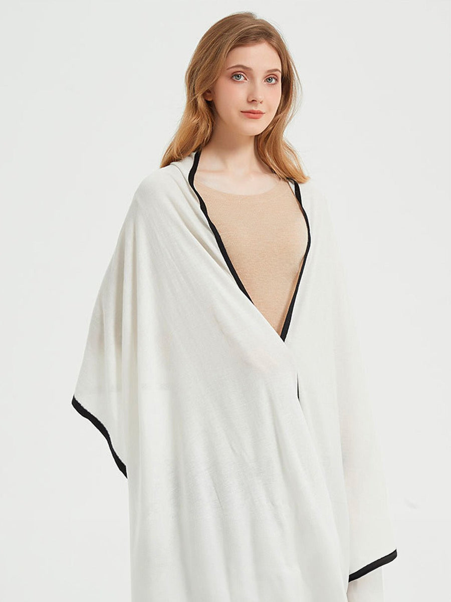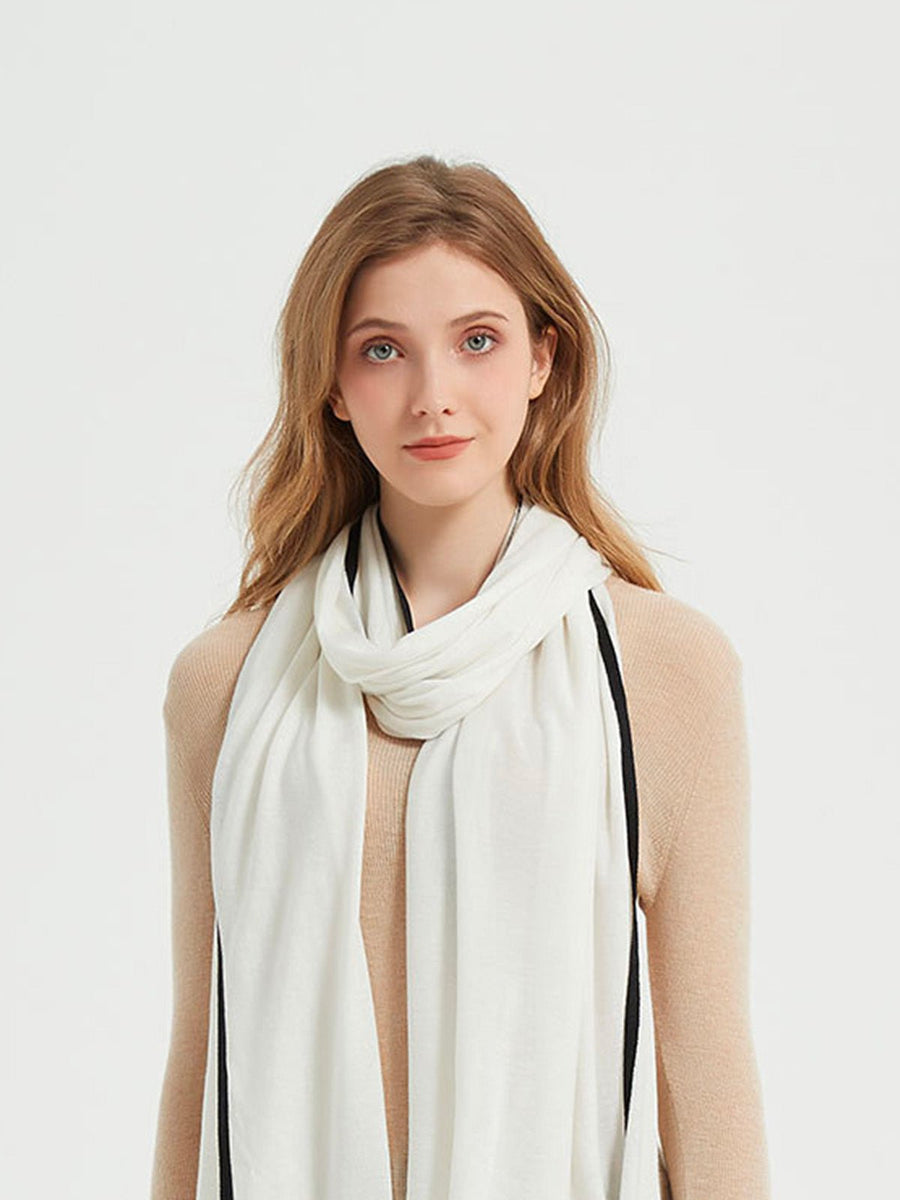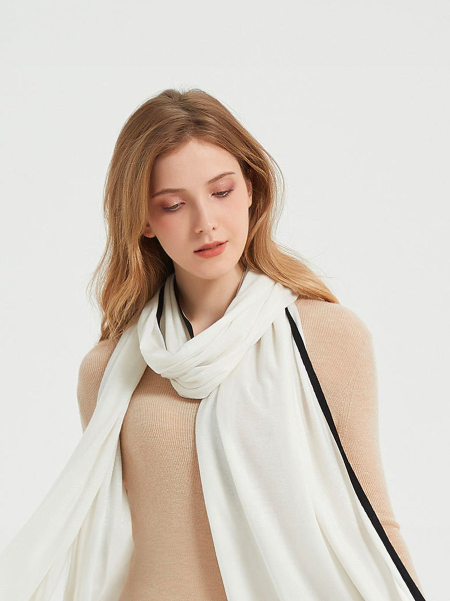 La sua lunghezza generosa di 192 cm consente di avvolgerla facilmente intorno al collo o di drapeggiarla elegantemente sulle spalle come uno scialle leggero. Il contrasto sottile del bordo colorato valorizza un design minimalista che si adatta a qualsiasi outfit, dal tailleur professionale al cappotto casual.