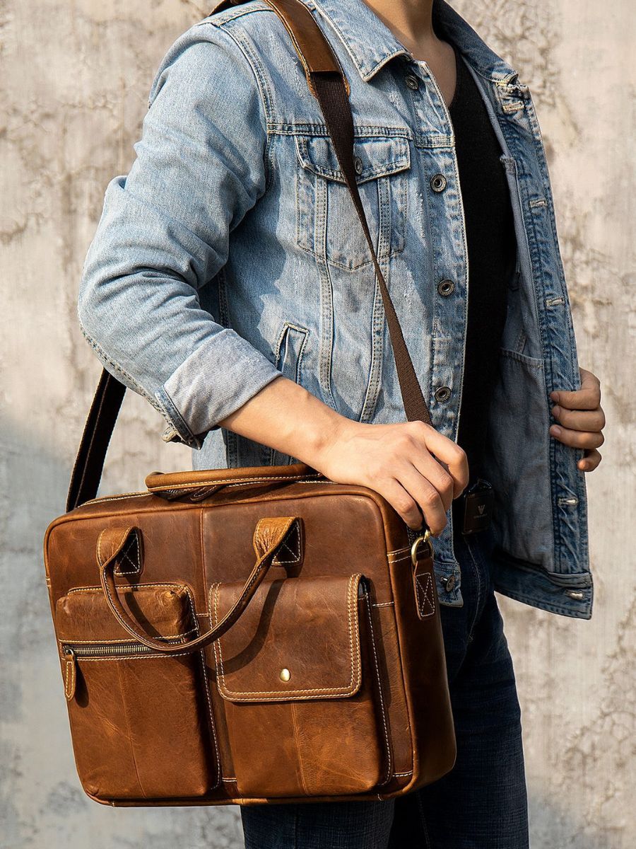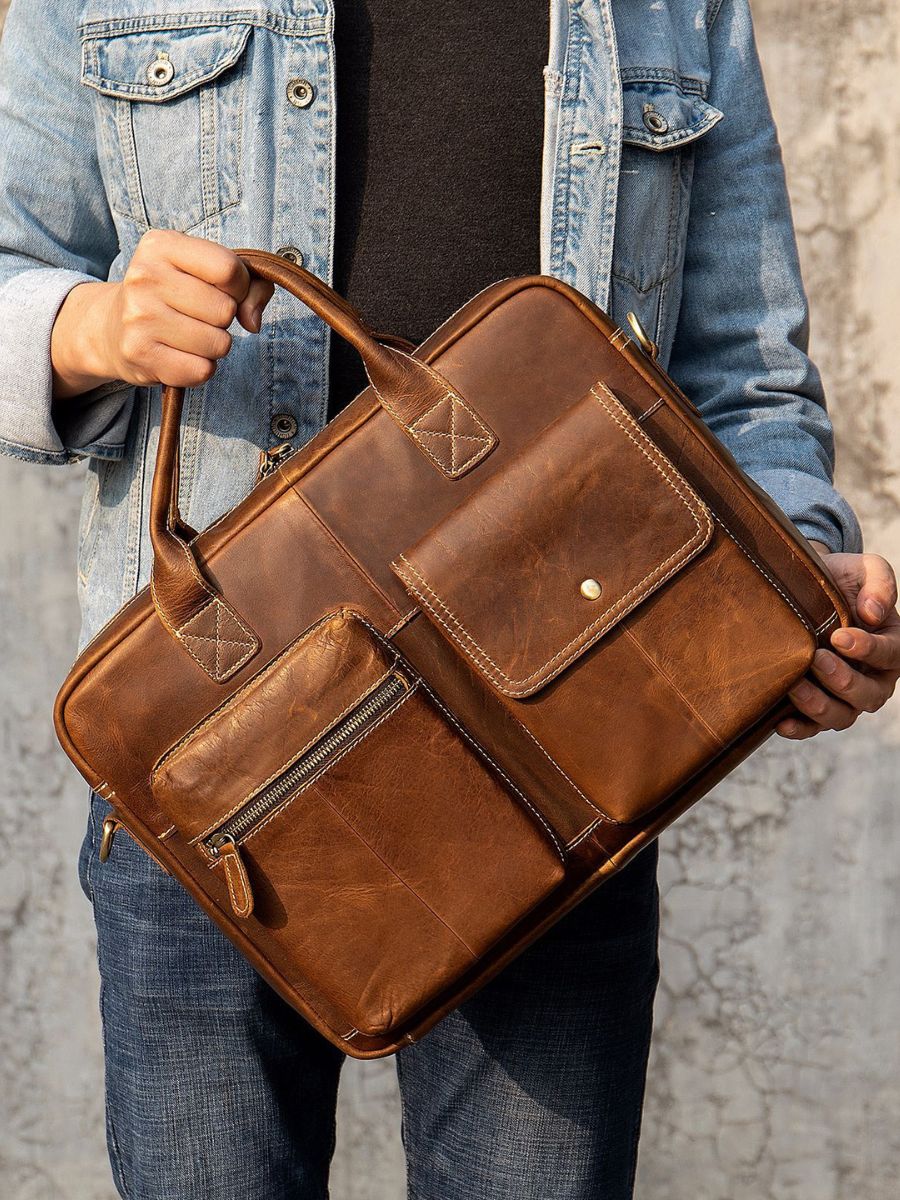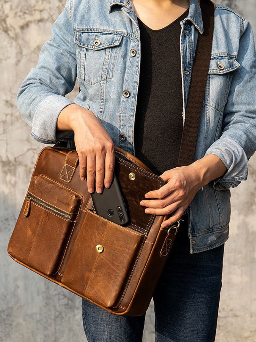 Scoprite la borsa da uomo in pelle pieno fiore che unisce durata e praticità, ideale per i professionisti e gli amanti dello stile retrò. Questa borsa spaziosa è progettata per trasportare facilmente i vostri oggetti essenziali quotidiani offrendo al contempo un look elegante.