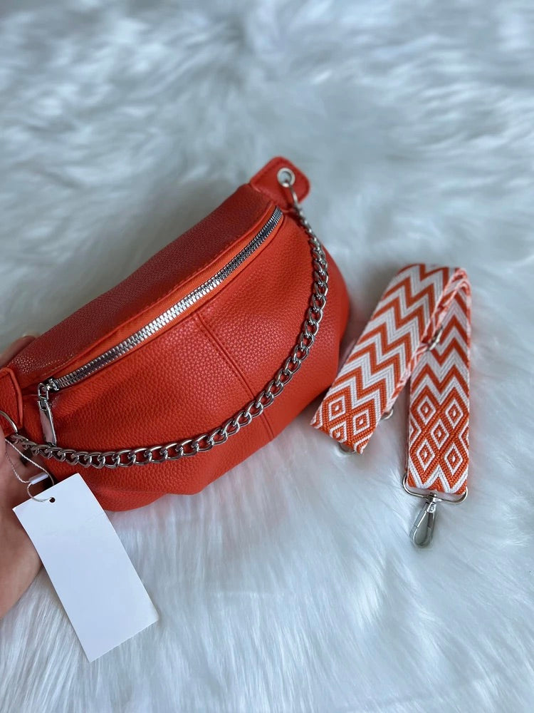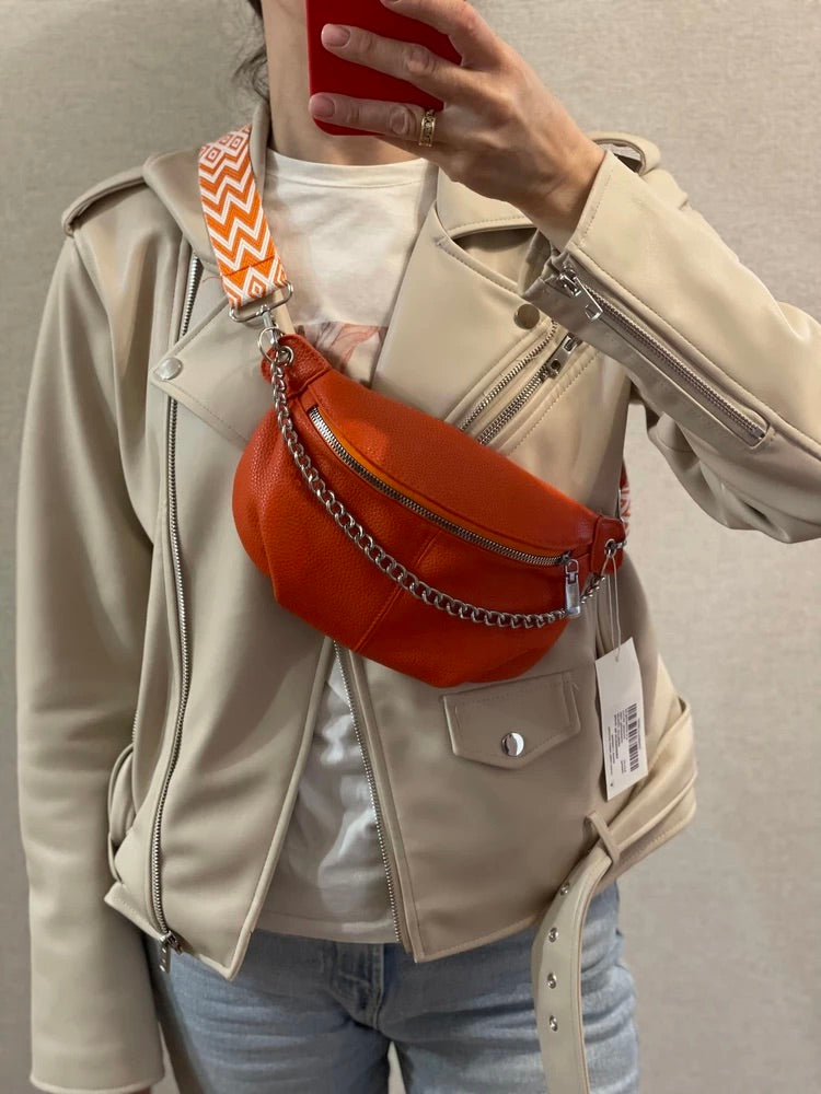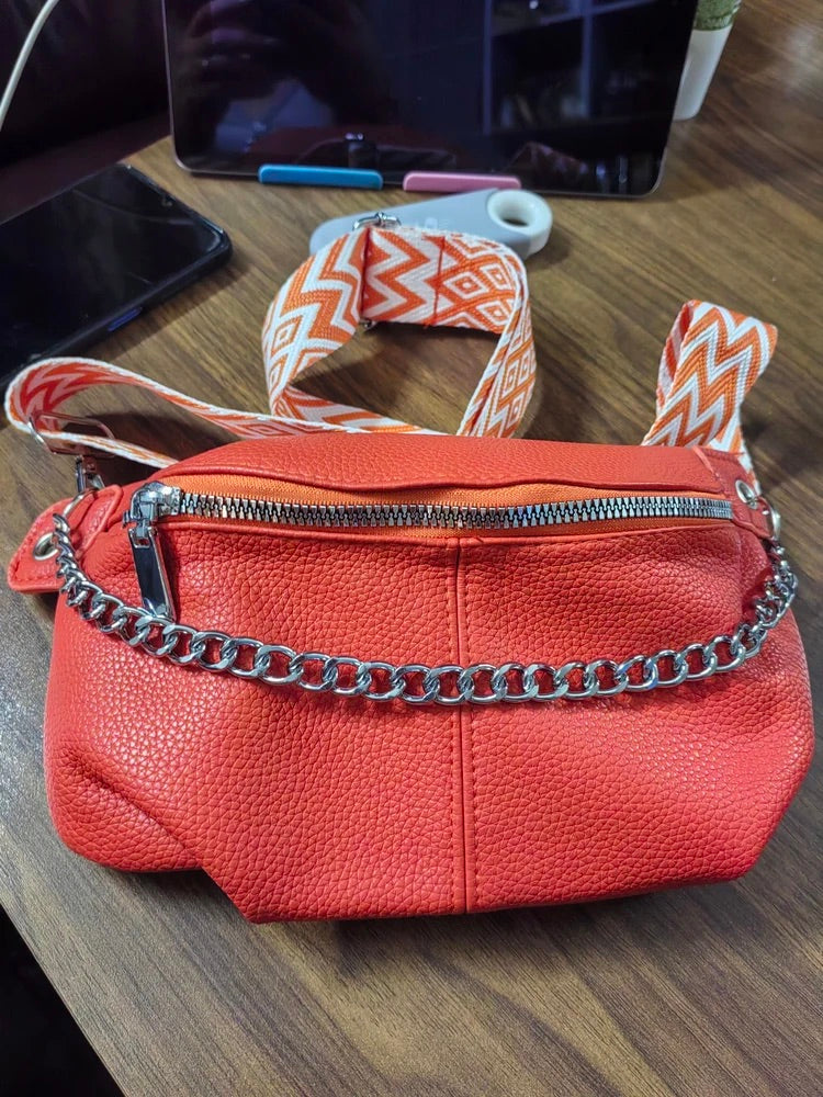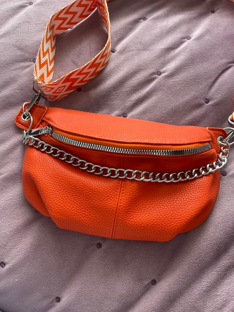 La sua tracolla amovibile e regolabile con motivo geometrico permette di adattarlo con facilità, sia per un indosso a spalla, a tracolla o in vita. Una catena in metallo argentato aggiunge un tocco urbano e contemporaneo alla silhouette della borsa.