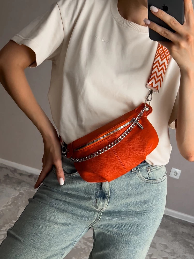 Con le sue linee arrotondate e la morbida pelle martellata, questo marsupio si distingue come un accessorio audace e altamente funzionale. Il suo formato compatto consente di riporre facilmente l’essenziale, mantenendo le mani libere nella vita quotidiana.