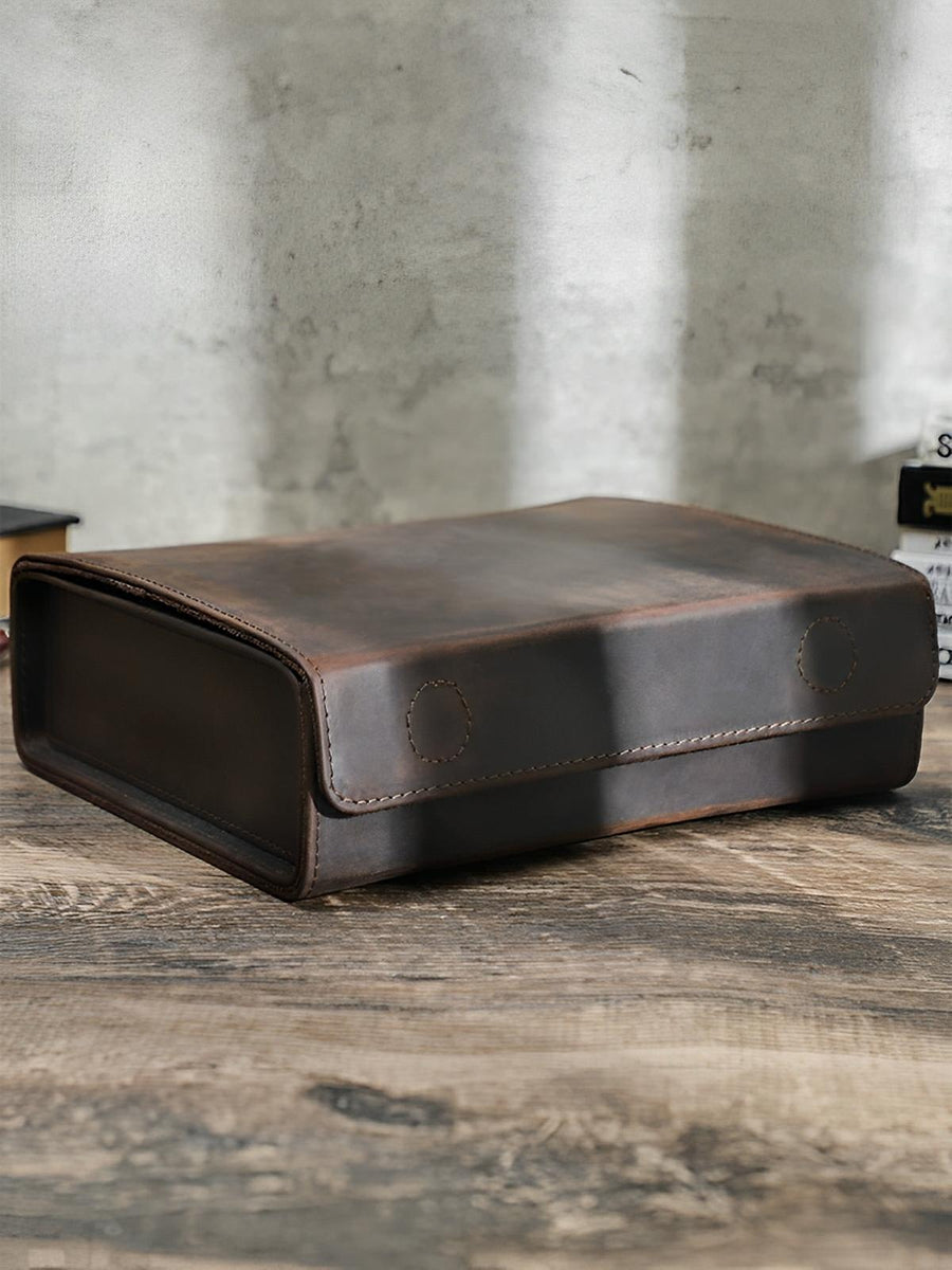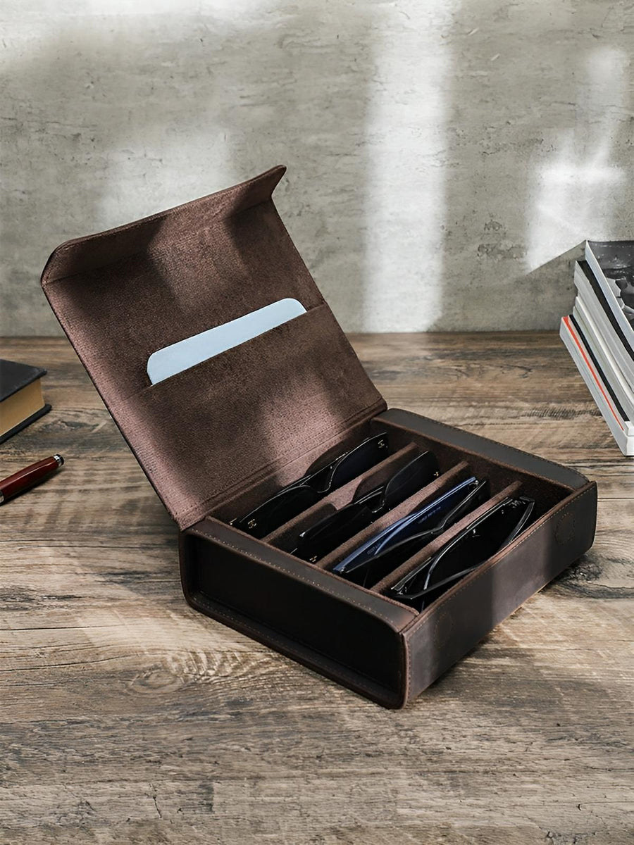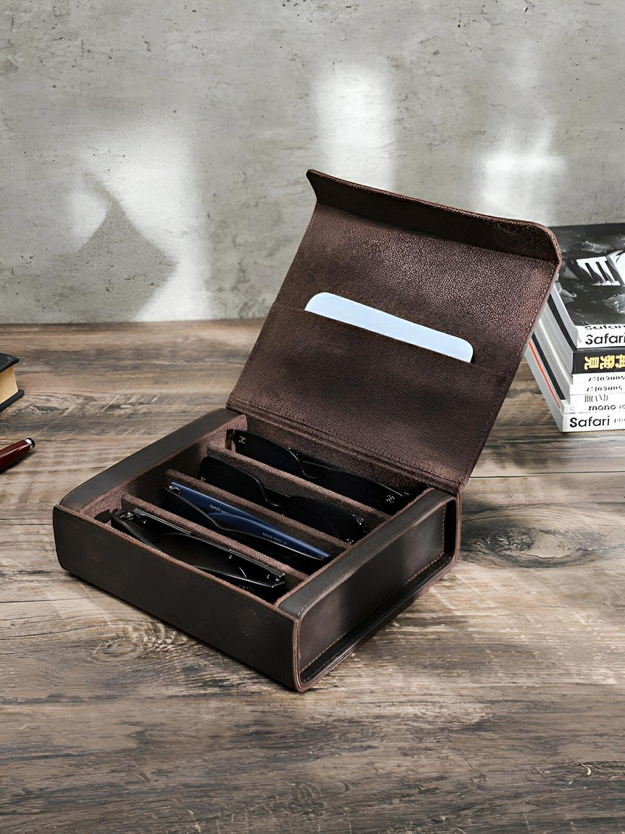 Scoprite un astuccio per occhiali raffinato, progettato per proteggere e organizzare le vostre montature preferite. Realizzato in pelle marrone invecchiata, unisce robustezza e stile, integrandosi perfettamente in un ambiente sofisticato o in un bagaglio da viaggio.