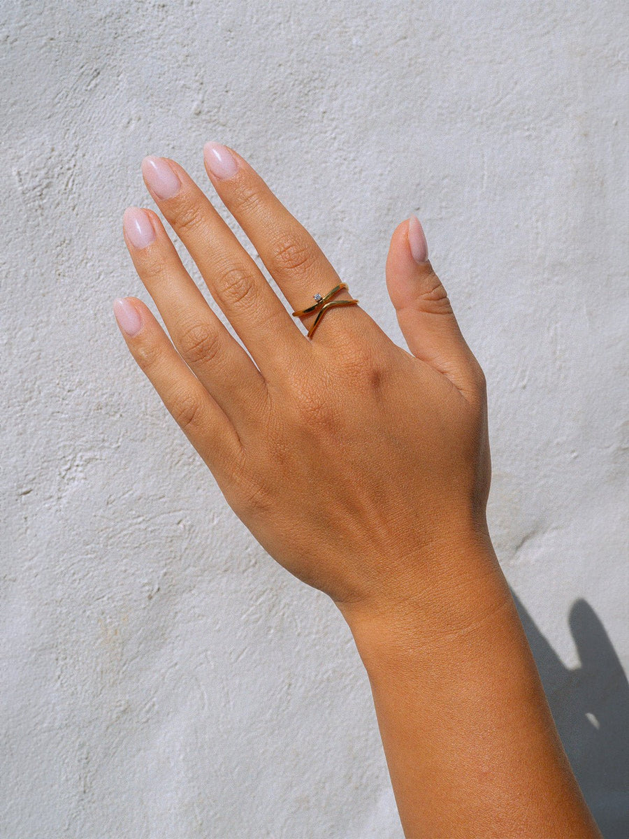 Anello incrociato dorato, pietra brillante, stile geometrico, vestibilità moderna, design minimal, modello Holor