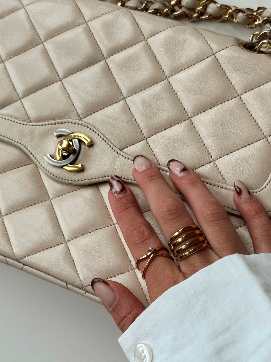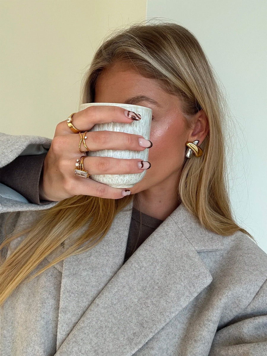 Questo anello incrociato dorato unisce modernità e delicatezza in un design strutturato. Con le sue linee essenziali che si intrecciano attorno al dito, offre un gioco di volumi sottile e raffinato.