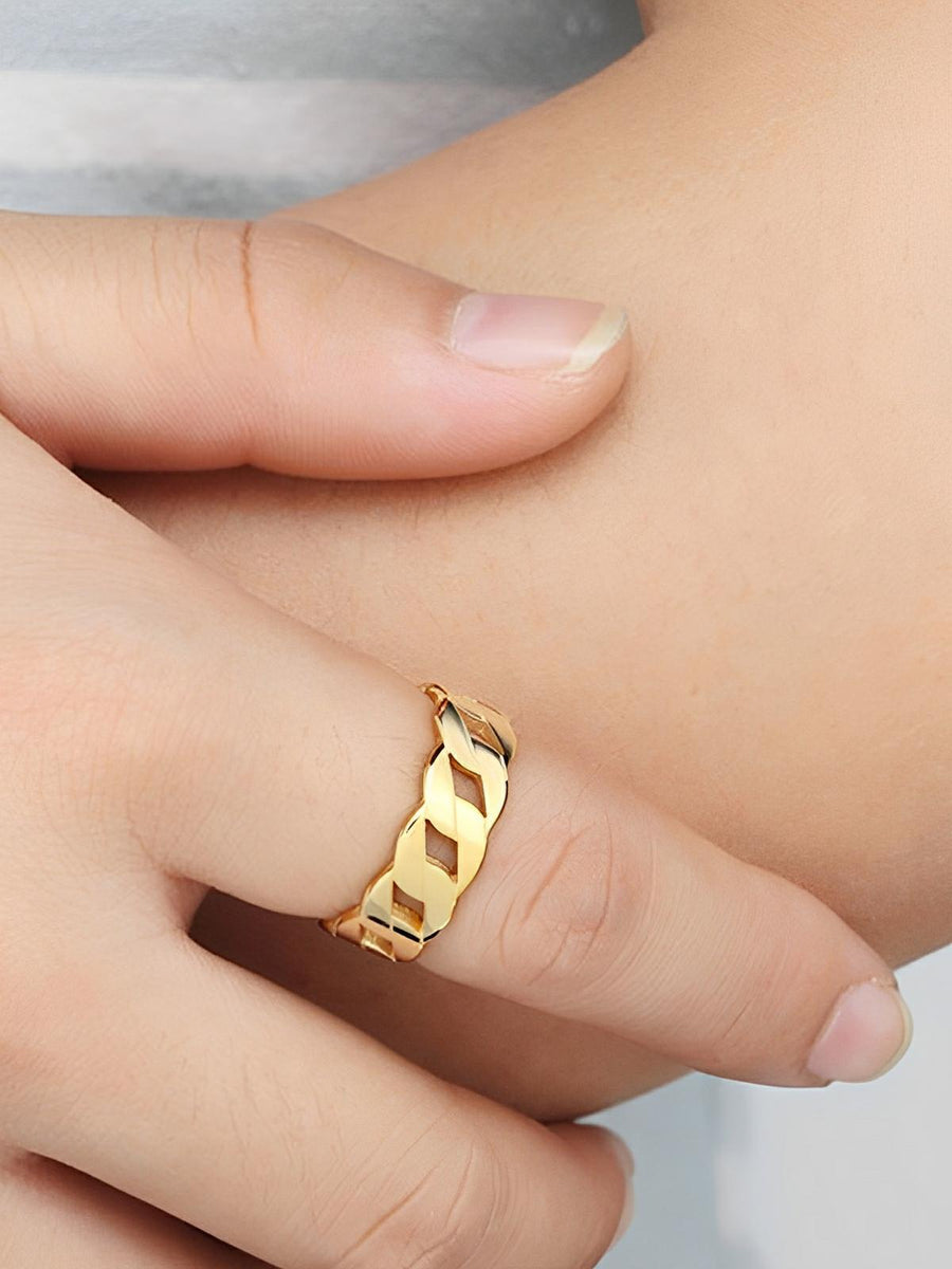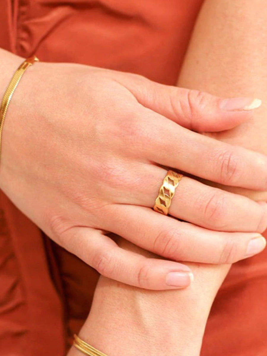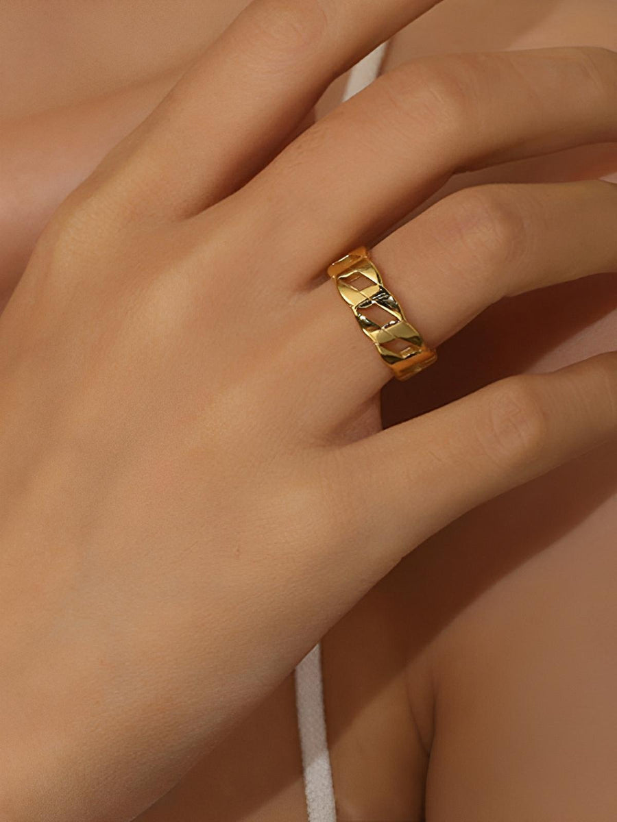 Evocando un'estetica moderna e scultorea, questo anello in acciaio inox placcato oro 18K conquista per il suo design traforato e le sue linee ondulate. La sua forma geometrica irregolare gli conferisce un aspetto distintivo, ideale per valorizzare i vostri gesti ogni giorno.