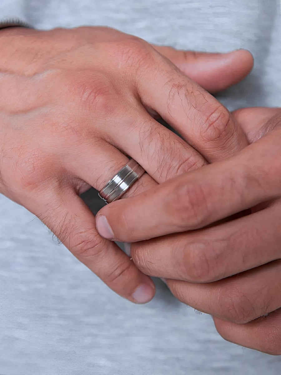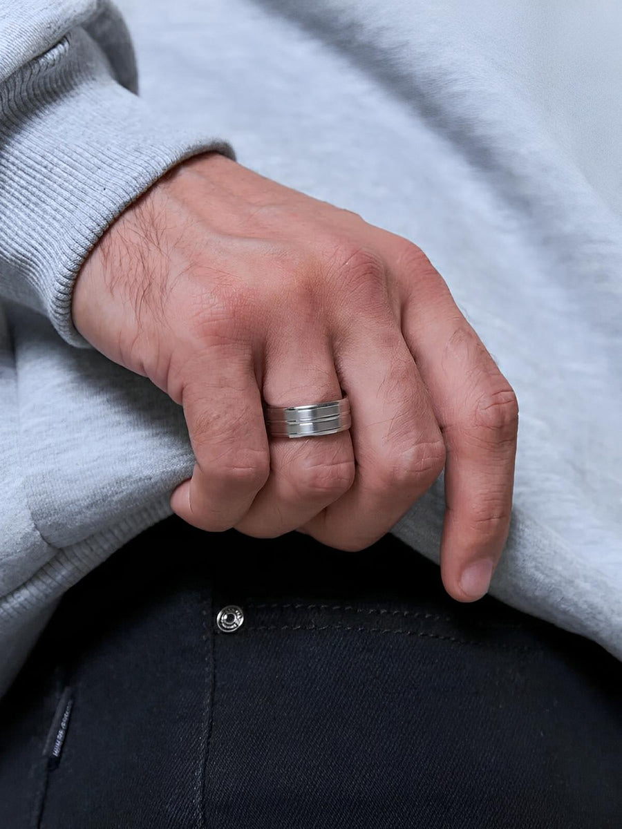 Progettato per chi cerca un accessorio robusto e deciso, questo anello in acciaio inossidabile è disponibile in tre finiture: nero profondo, dorato intenso o argento spazzolato. La sua larghezza di 8 mm e le scanalature centrali simmetriche gli conferiscono un aspetto potente e contemporaneo, ideale per strutturare un outfit con carattere.