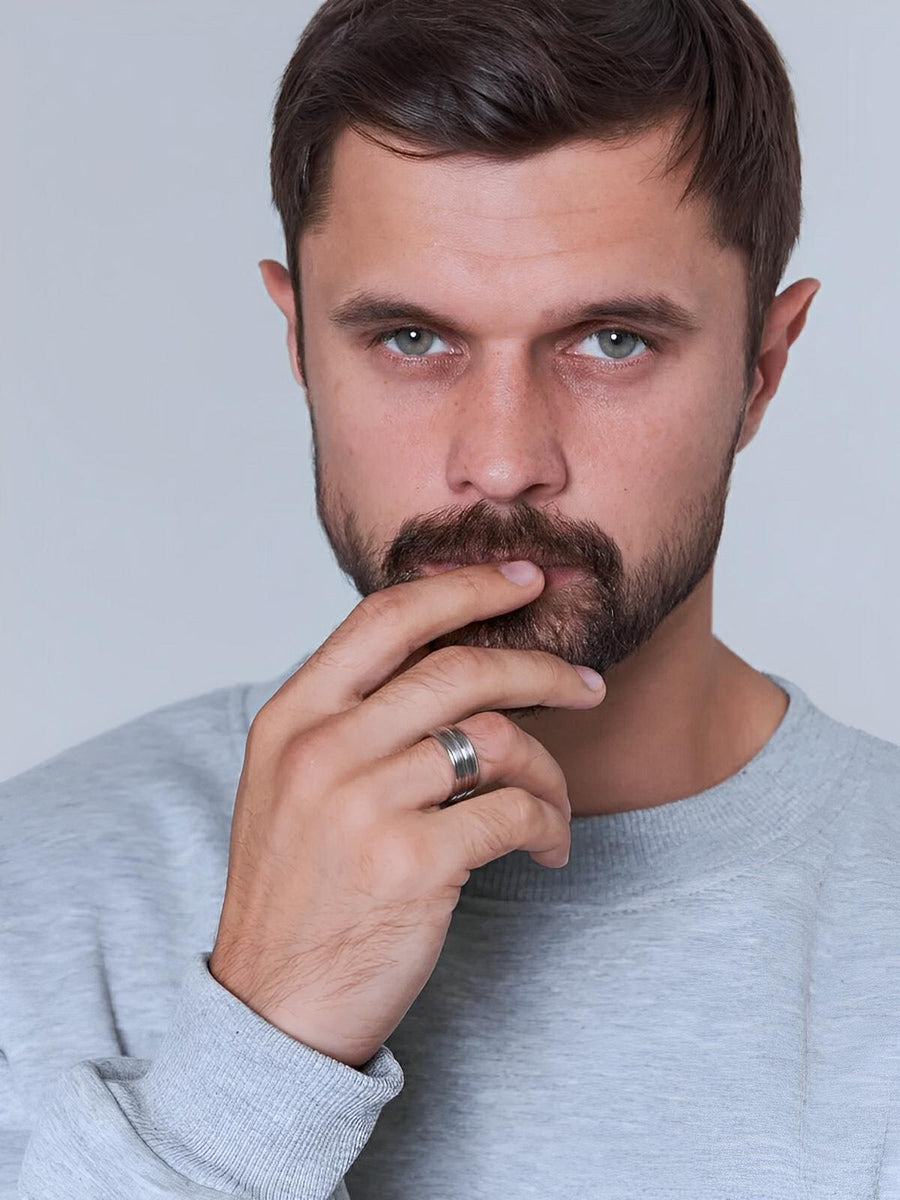 La sua texture opaca evita le impronte e riflette la luce in modo discreto, esaltando il rilievo pur rimanendo sobria. È perfettamente adatto all’uso quotidiano, sia al lavoro che nel tempo libero. La scelta dell’acciaio inossidabile garantisce un indosso senza allergie, senza scolorimento e un’elevatissima resistenza ai graffi.