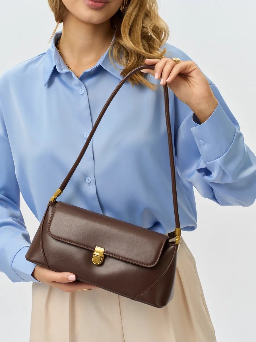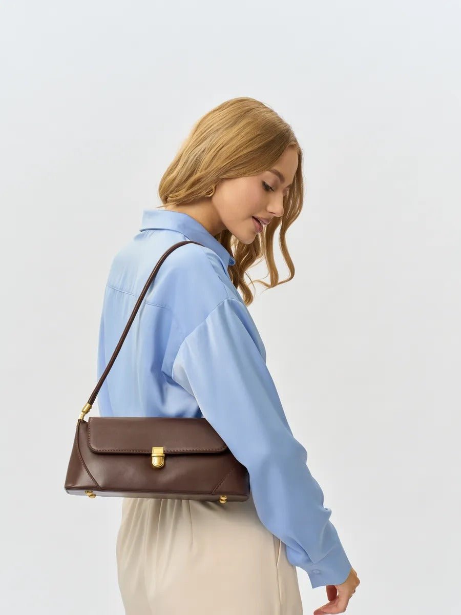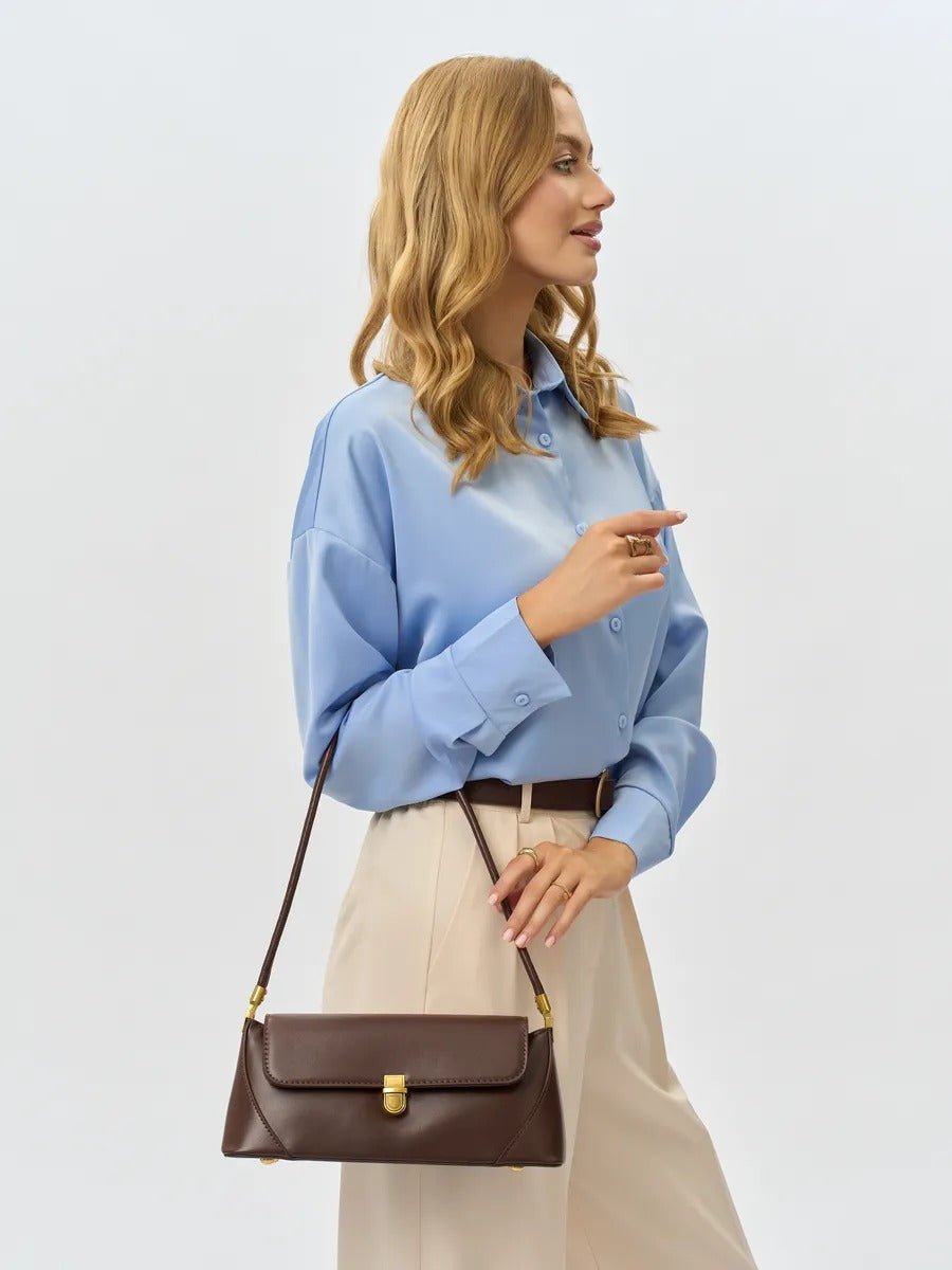 Questa borsa baguette unisce sobrietà e design vintage in un formato pensato per l’uso quotidiano. La sua silhouette allungata e strutturata la rende un accessorio perfetto per chi cerca una piccola borsa rigida facile da abbinare, al tempo stesso di tendenza e funzionale.