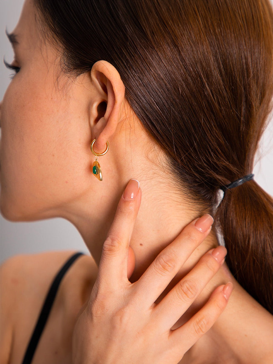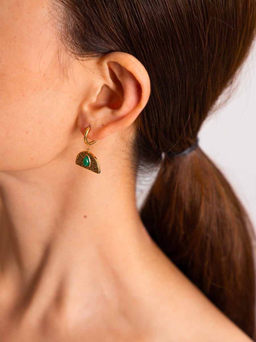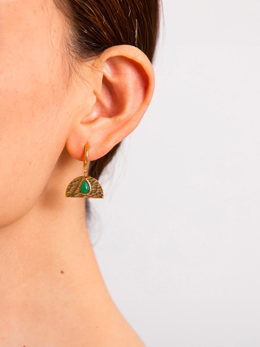 Questi orecchini in acciaio inox placcato oro 18K presentano un pendente a forma di mezzaluna texturizzata, con una superficie martellata dai riflessi caldi. Al centro, una pietra naturale di giada malese a goccia cattura la luce e aggiunge un tocco vibrante al vostro stile.
