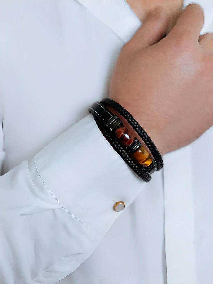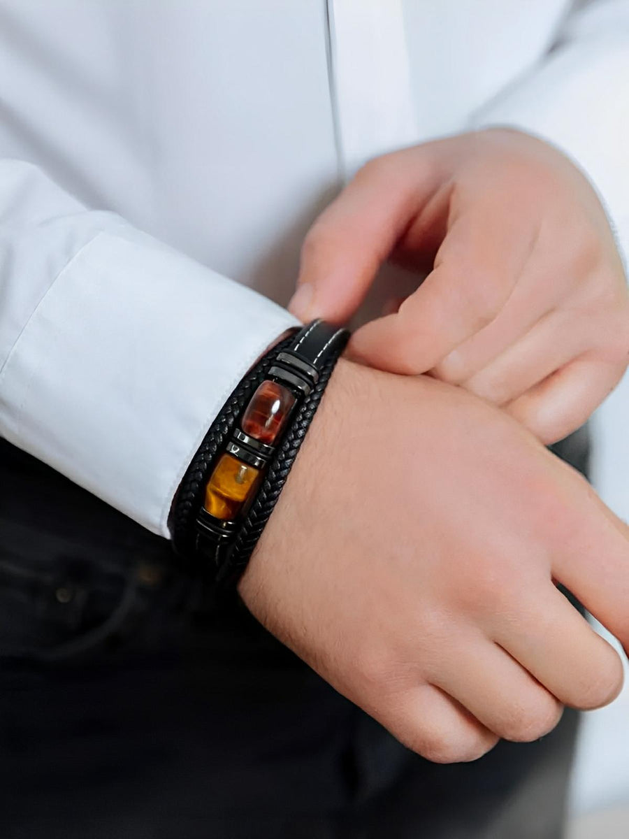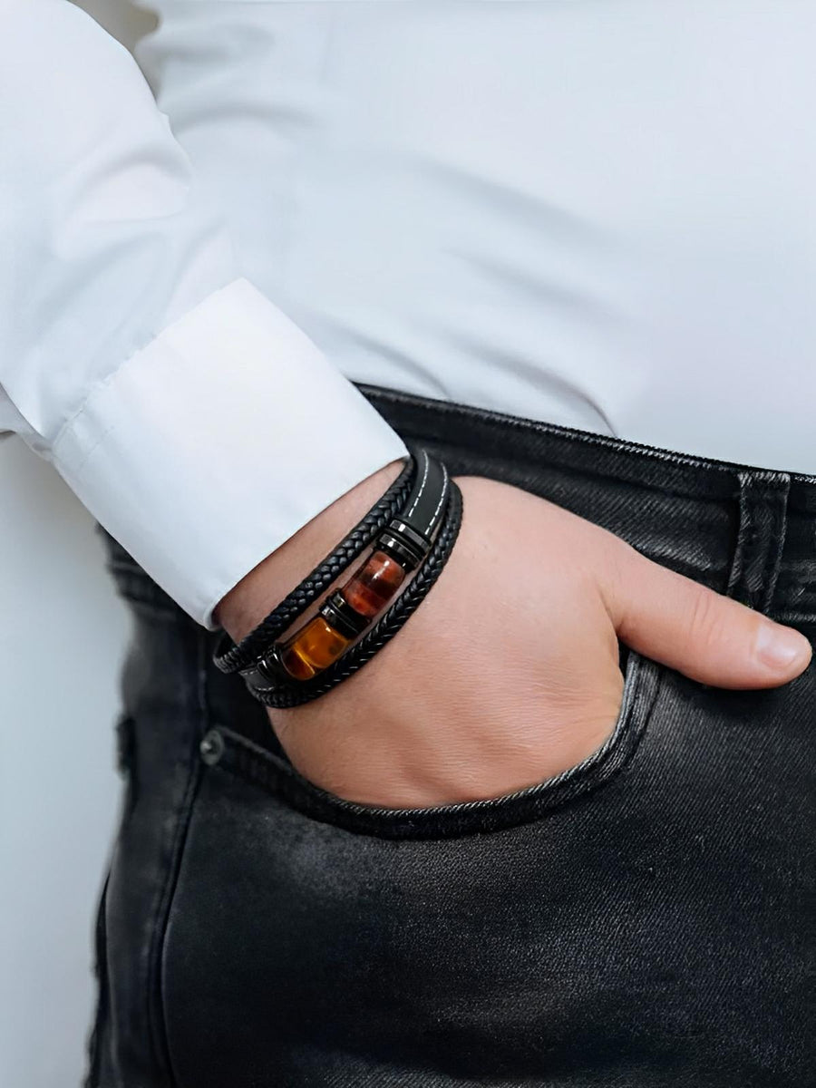 Bracciale multigiro in pelle intrecciata, pietre occhio di tigre, chiusura magnetica, gioiello uomo, modello Jack