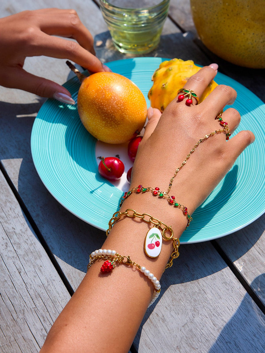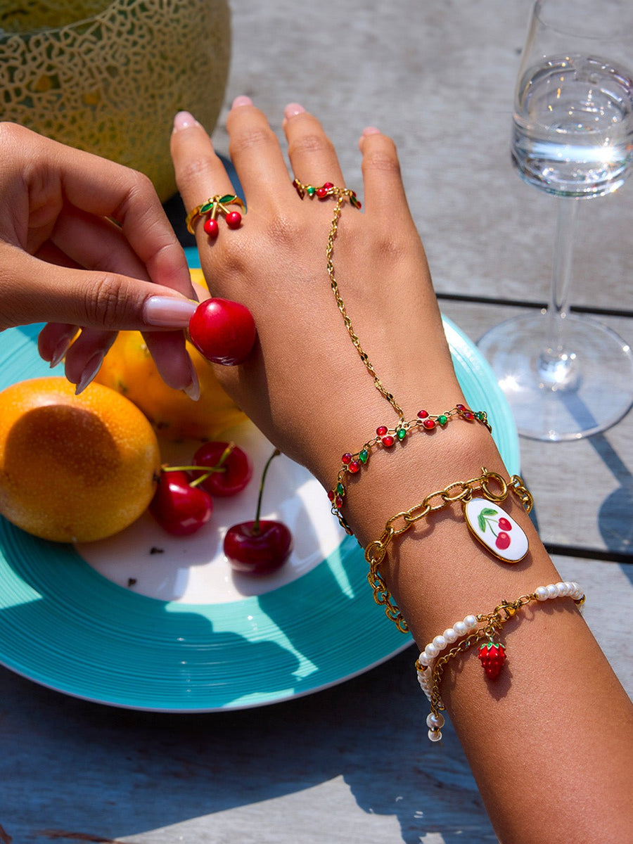 Bracciale a catena in acciaio inossidabile, ciondolo smaltato con ciliegie, dorato, impermeabile, ipoallergenico, estate, modello Jade