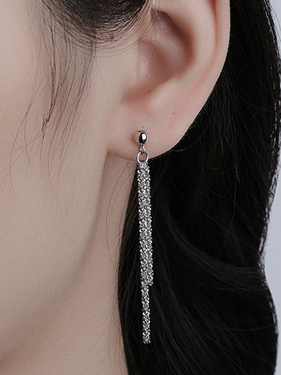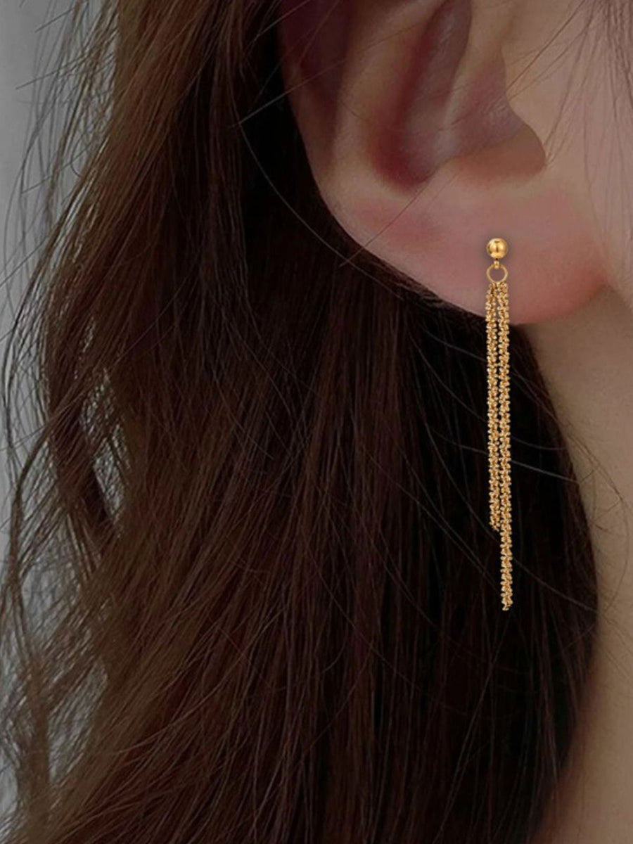 Portate un tocco di luce ai vostri outfit con questi orecchini lunghi. Realizzati in acciaio inox dorato, si distinguono per un design geometrico delicato e una doppia catena fluida terminata da un raffinato pendente. La loro struttura leggera e ben studiata offre una caduta naturale, ideale per valorizzare la linea del collo.