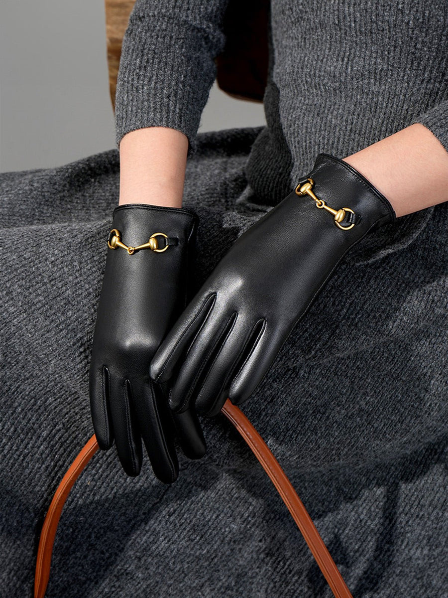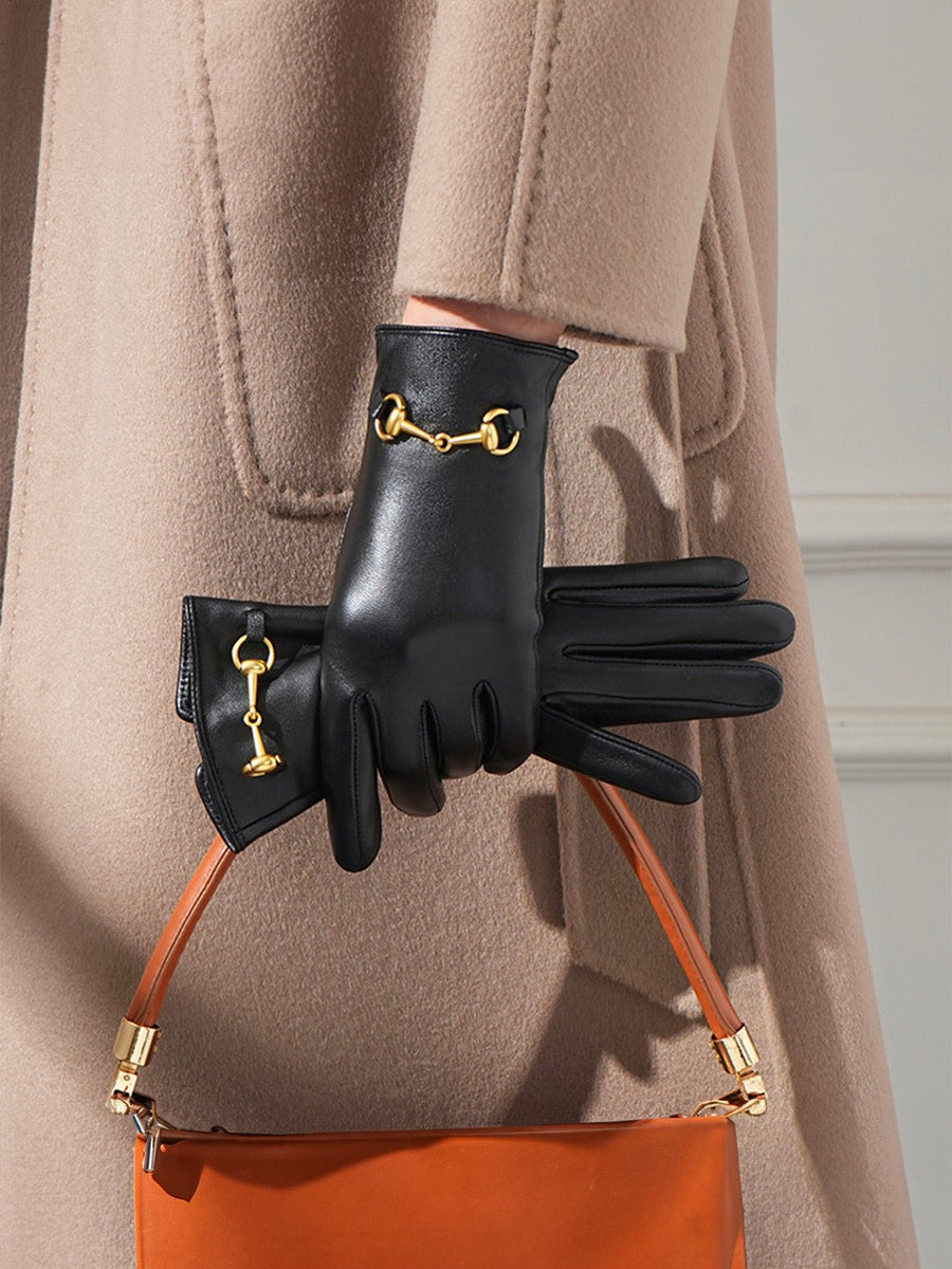 Guanti in pelle da donna neri, accessorio invernale in pelle, guanti foderati caldi, eleganti touch screen, guanti con dettaglio dorato, modello Jinya