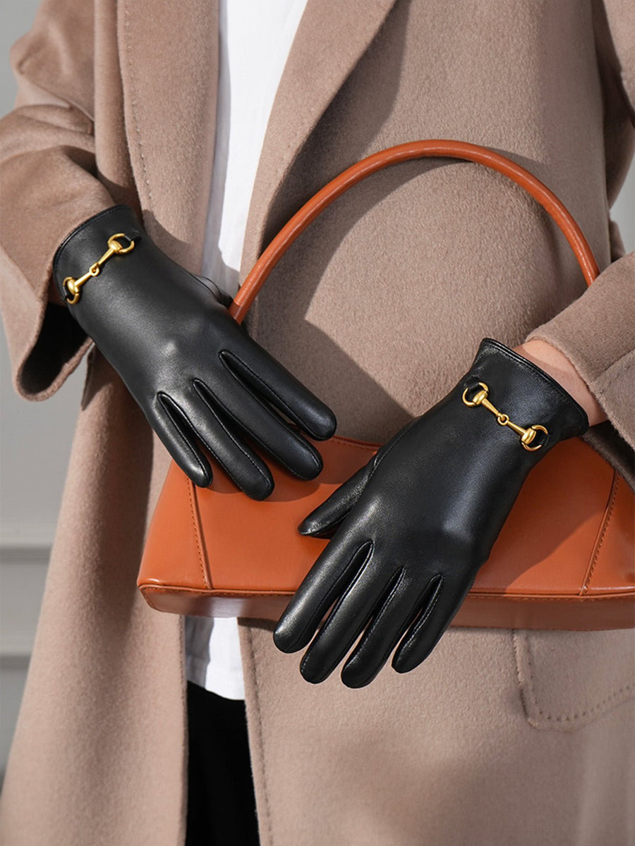 La superficie esterna in pelle di agnello liscia offre un tocco morbido e lussuoso. Un dettaglio metallico dorato valorizza il polso, aggiungendo un tocco di carattere discreto e raffinato a ogni outfit. Questi guanti sono anche compatibili con gli schermi touch, consentendo un utilizzo agevole del telefono senza doverli togliere.