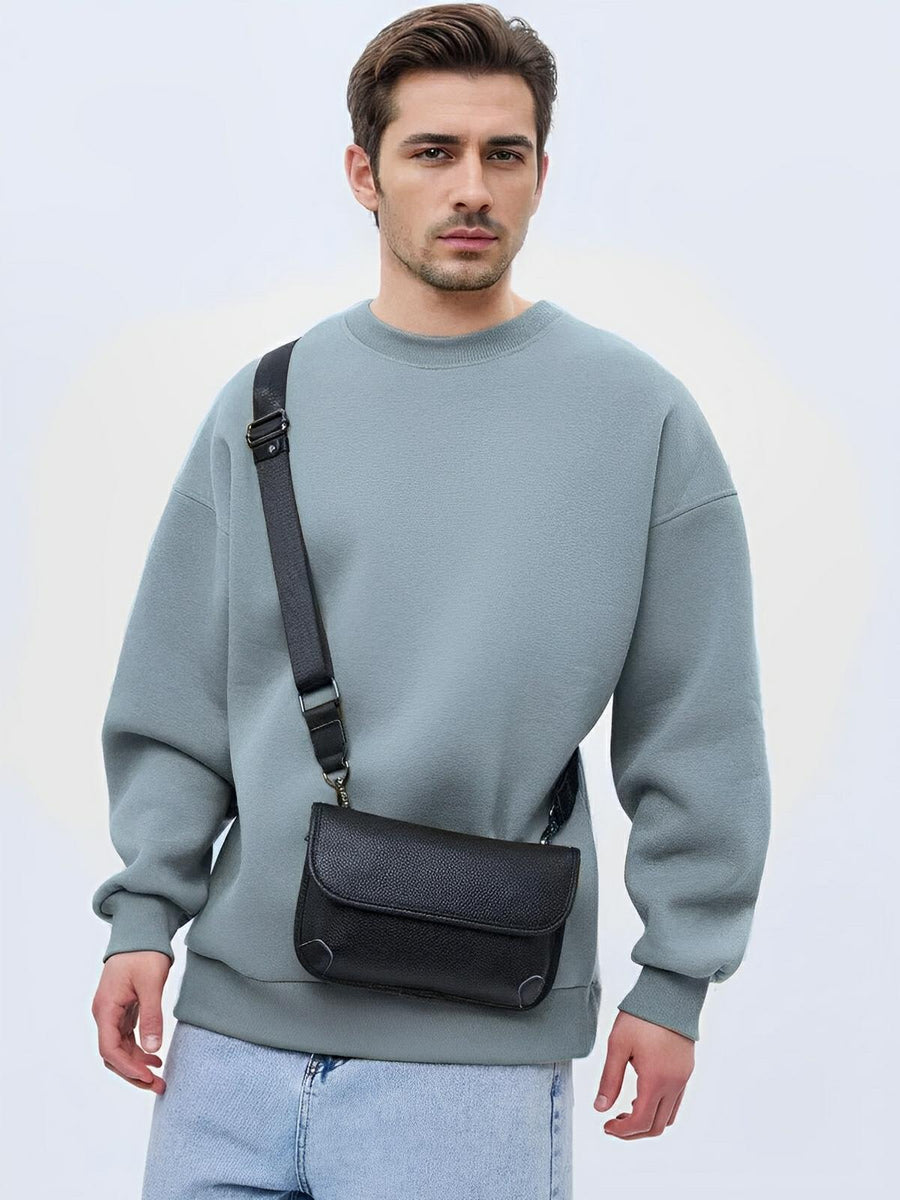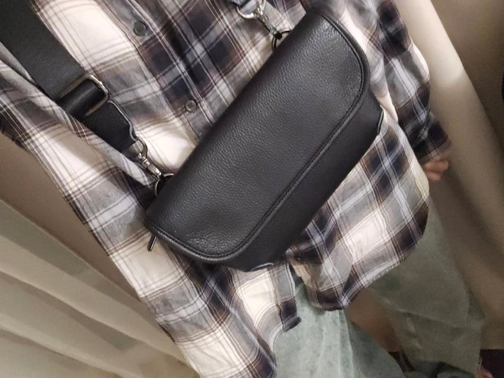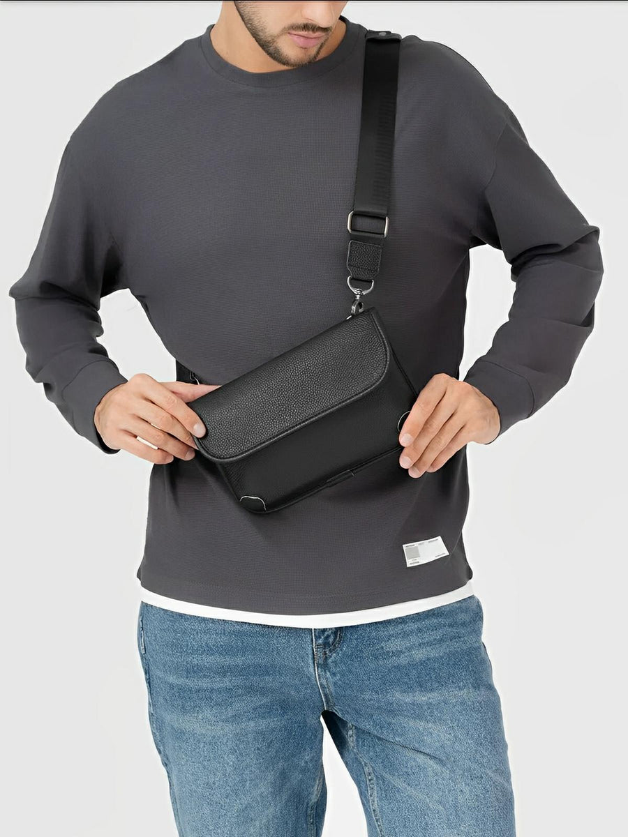Realizzata in vera pelle, presenta una texture leggermente granulosa che le conferisce un aspetto sobrio e moderno. Il suo sistema di chiusura combina una patta con bottoni magnetici e una cerniera lampo per una sicurezza rinforzata. All’interno, un comparto principale foderato in tessuto accoglie portafoglio, telefono e altri piccoli oggetti, mentre una tasca con zip permette di mettere al sicuro gli effetti personali.